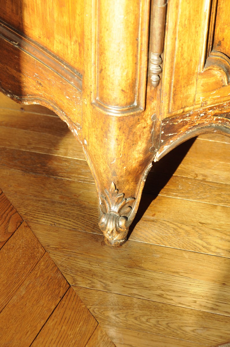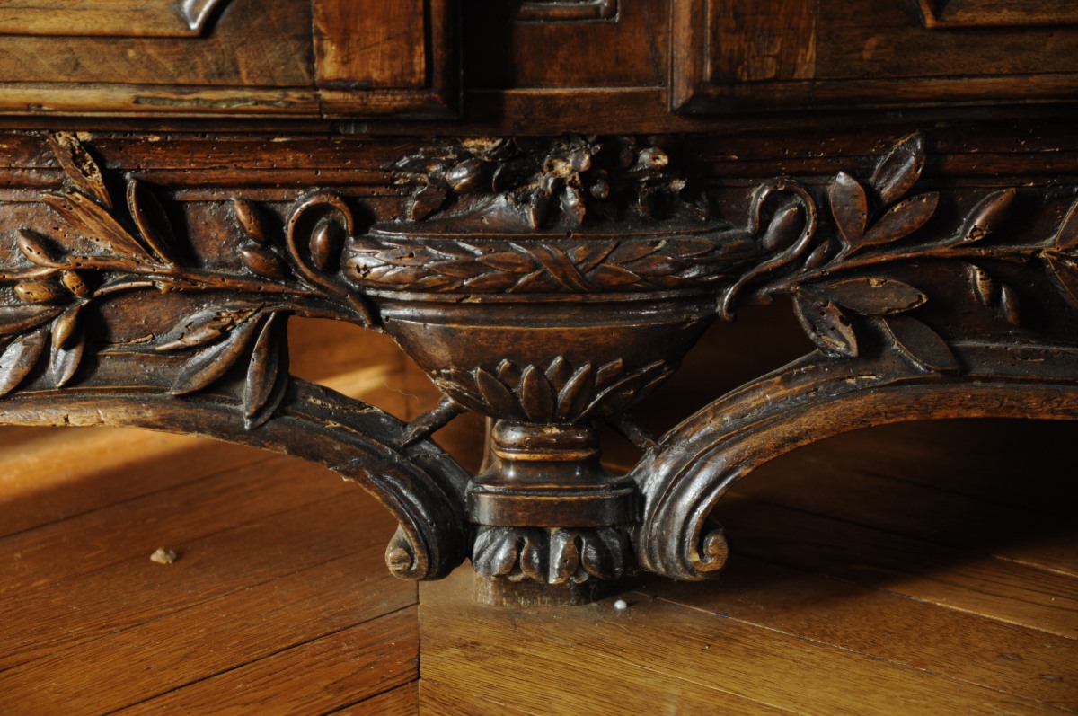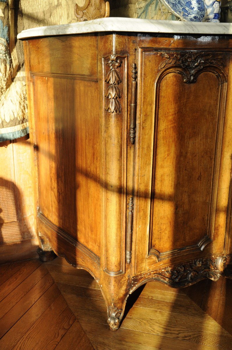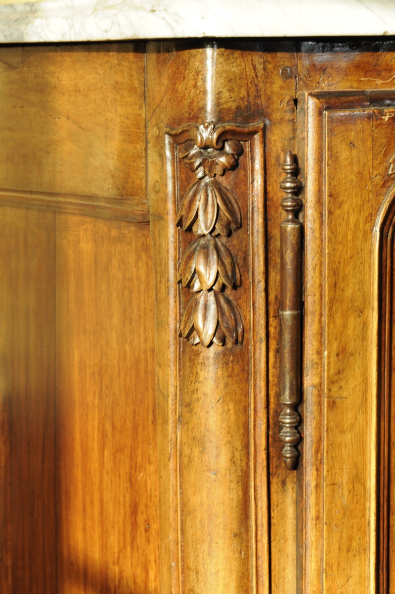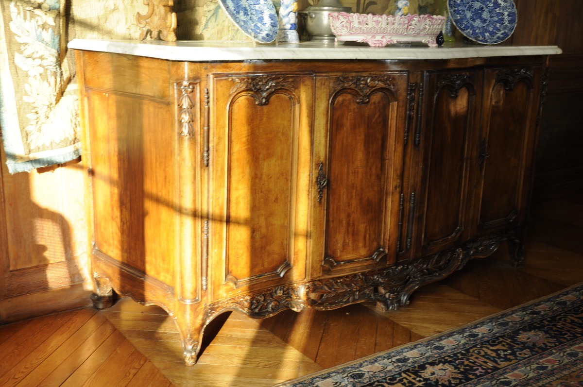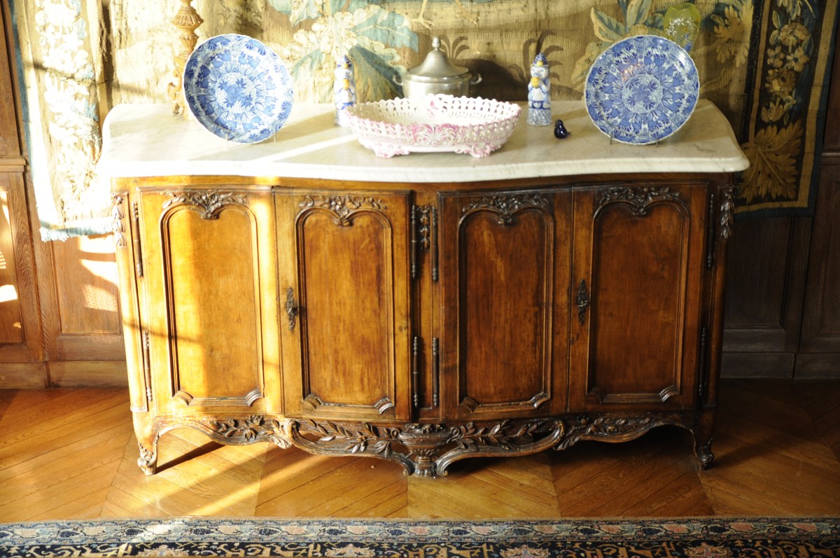 ENFILADE en chêne mouluré et sculpté ouvrant à deux fois deux portes sculptées de fleurs et feuillages encadrant des compartiments en réserves. La ceinture ajourée et sculptée d'un vase fleuri de lauriers, les chutes d'angles à feuille de laurier. Elle repose sur quatre pieds enroulés de feuillages. Entrées de serrure et charnières métalliques ouvragées. Dessus de marbre blanc.