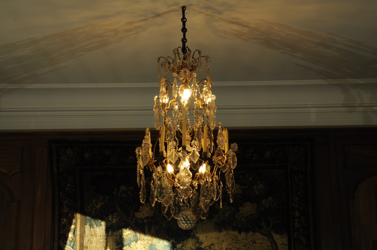 Grand LUSTRE CAGE en bronze, fer forgé, verre et cristal à neuf feux, orné de quatre couronnes de pampilles, pendeloques et poignards séparées par six pilastres, réunies à un fût central soutenant une grande boule facetée. Électrifié en parties haute et basse de deux fois trois lumières (quinze au total).