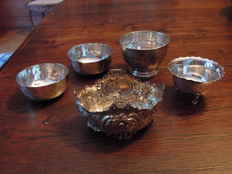Cinq COUPELLES en argent et métal argenté, une sur piédouche à côtes, une autre reposant sur trois pieds travail anglais, la troisième de style Rocaille à décor d'amours, de cartouches et de feuillages, les deux dernières martellées.