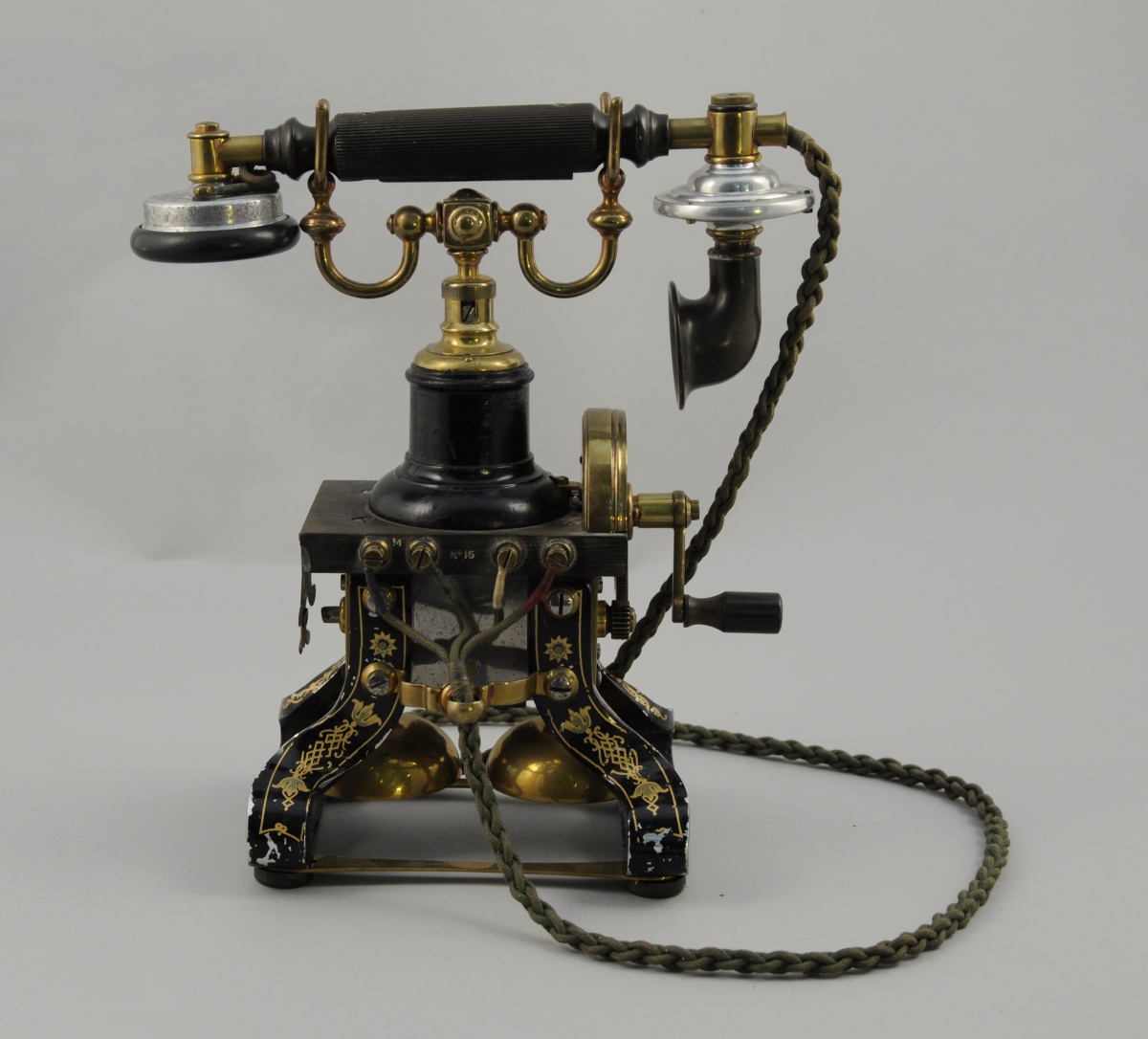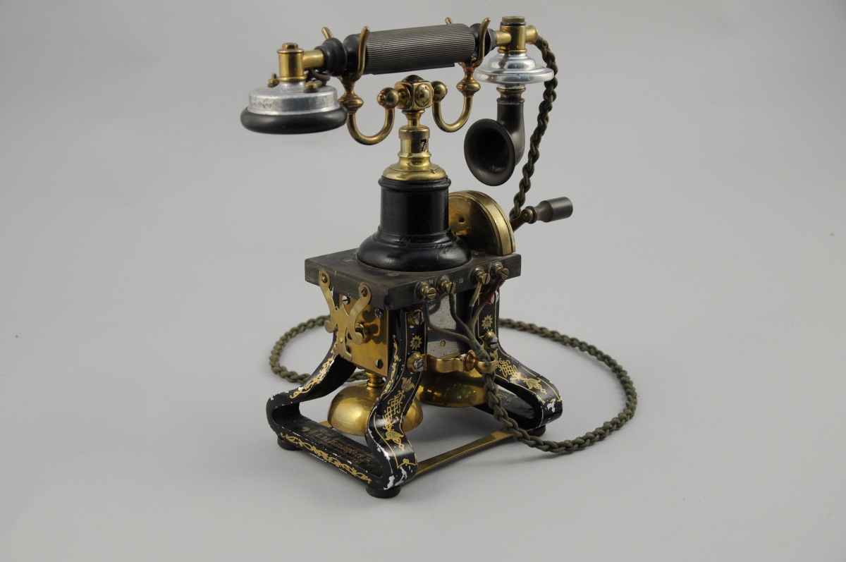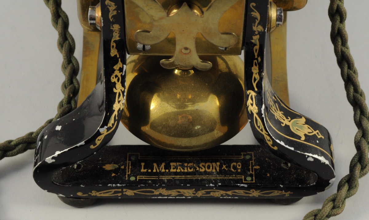 L.M. ERICSSON AND CO. Téléphone mobile dit "Machine à coudre" en métal laqué, laiton et bois peint. Piètement en métal laqué noir à décor de ferronneries vert et or. Combiné, manivelle et deux timbres de sonnerie incorporés. Modèle 1894. Marqué "L.M. ERICSSON & Co" de chaque côté du piètement. (petits manques)