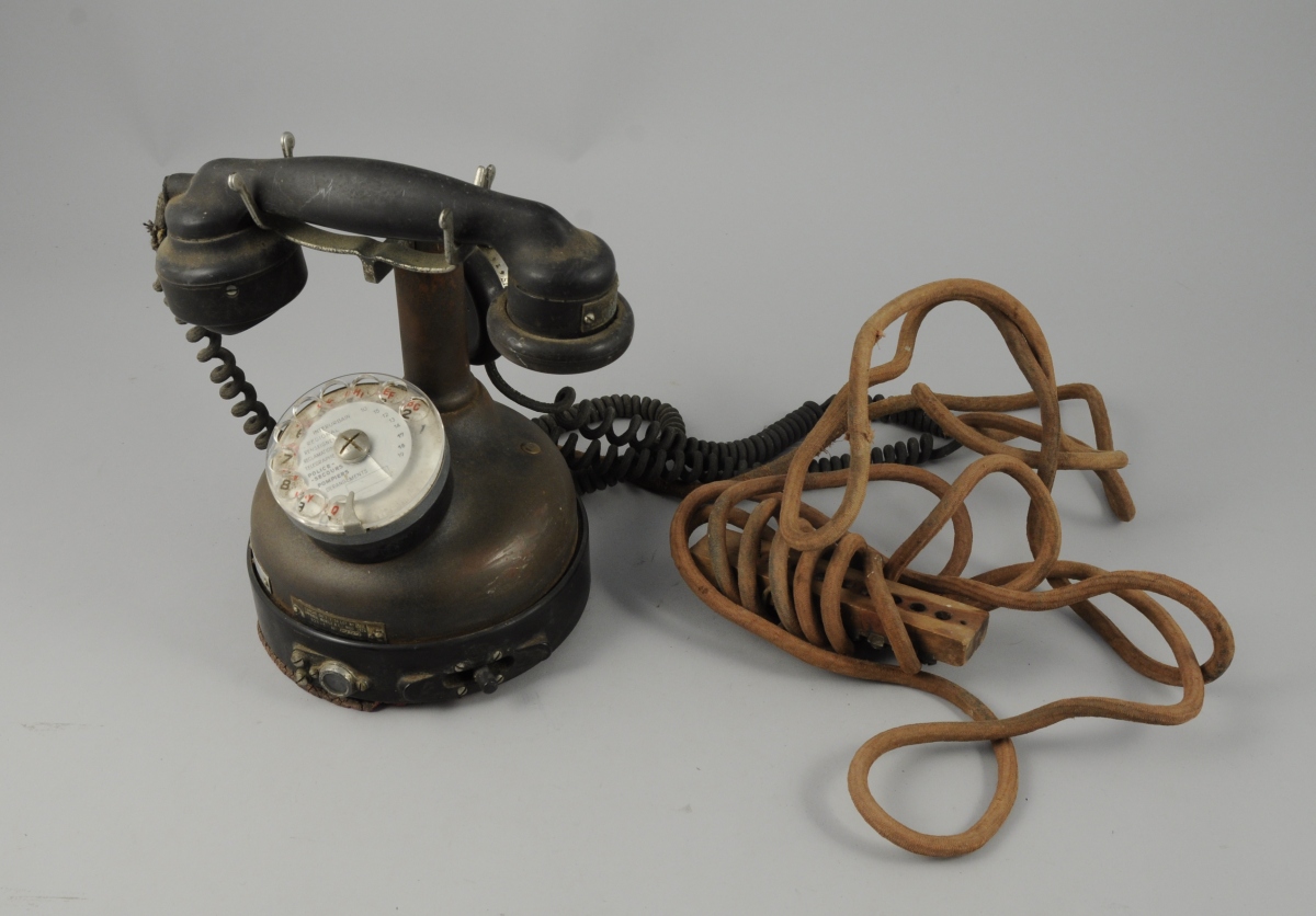 SIT. Téléphone mobile en bakélite et métal à cadran. Plaque marquée "Marché du 7-2-34 / Lot N°55 / Appareil mobile B.C.I / Mod. 1924 / 321-1 N°2777 / Sté INDlle des téléphones-consic", monogramme "LD", tampon "Propriété de l'État sur le combiné". Années 1920-1930. (usures, accidents, cadran grippé)