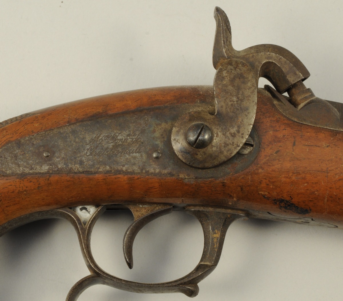 Paire de PISTOLETS D'OFFICIER à percussion, modèle réglementaire 1833, 2ème type (?), à canons octogonaux rayés et damassés. Crosses en noyer guilloché. Les platines marquées "Mre Impale de Châtellerault". Les canons marqués 1855, MI, et poiçonnés F et C. Longueur: 37 cm, Canon 22,5 cm.