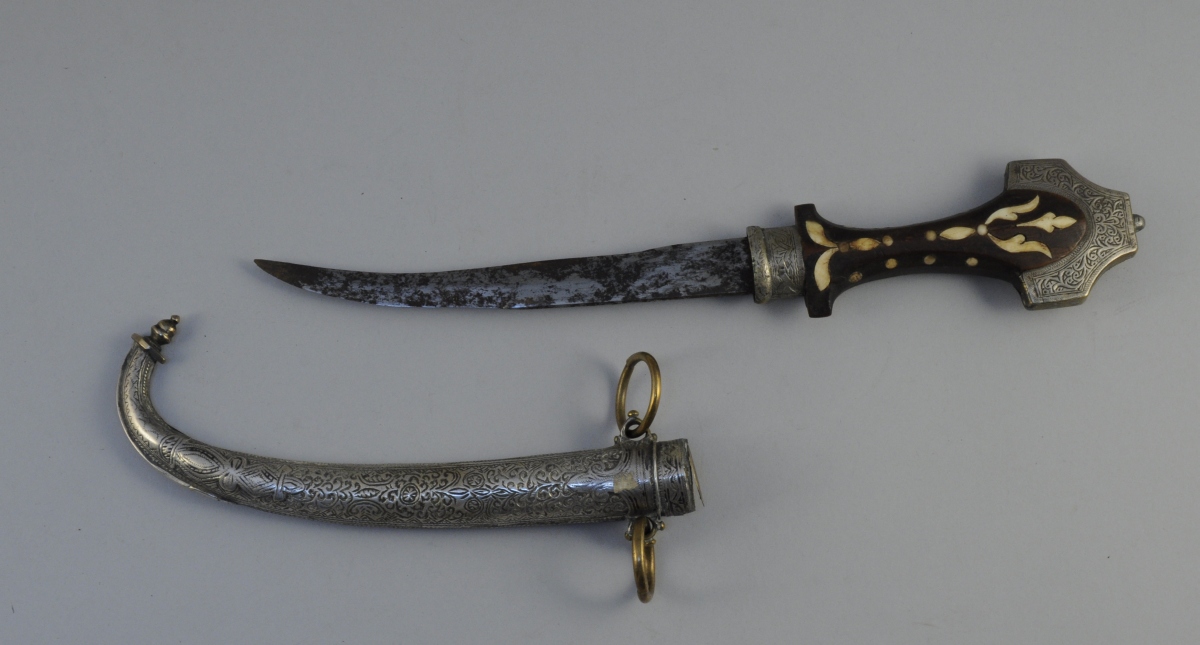 POIGNARD Marocain dit Koumya. Poignée en bois incrusté de morceaux d'os découpé. Garnitures en laiton, surmonté sur le devant de plaques d'argent ciselées de rinceaux. Lame courbe à dos plat et contre tranchant. Fourreau à deux anneaux de suspente en laiton, enrichi d'une plaque d'argent sur le devant, ciselée à décor en suite.