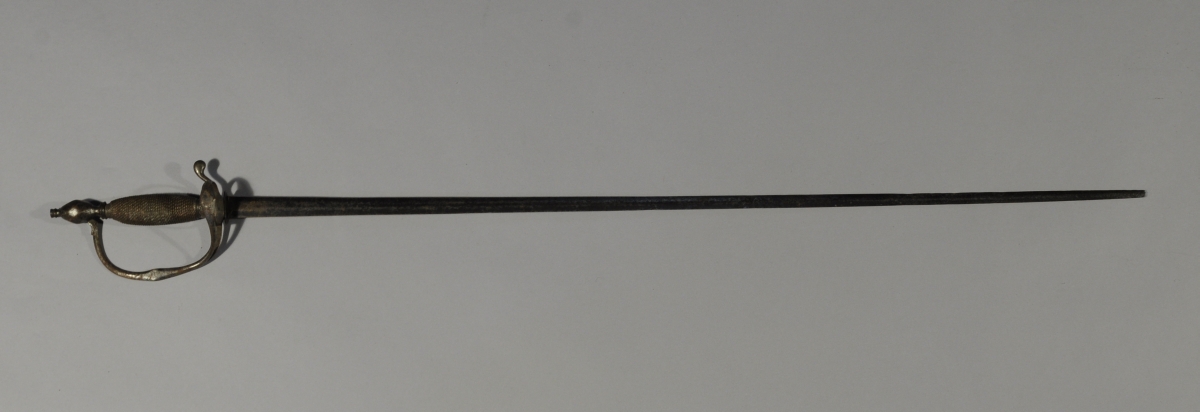 ÉPÉE. Monture en fer à une branche principale décoré au centre d'un losange et une secondaire. Anneau et pommeau facetés. Quillon recourbé. Fusée entièrement filigrannée de cuivre. Lame à double tranchant (brisée). Sans fourreau.