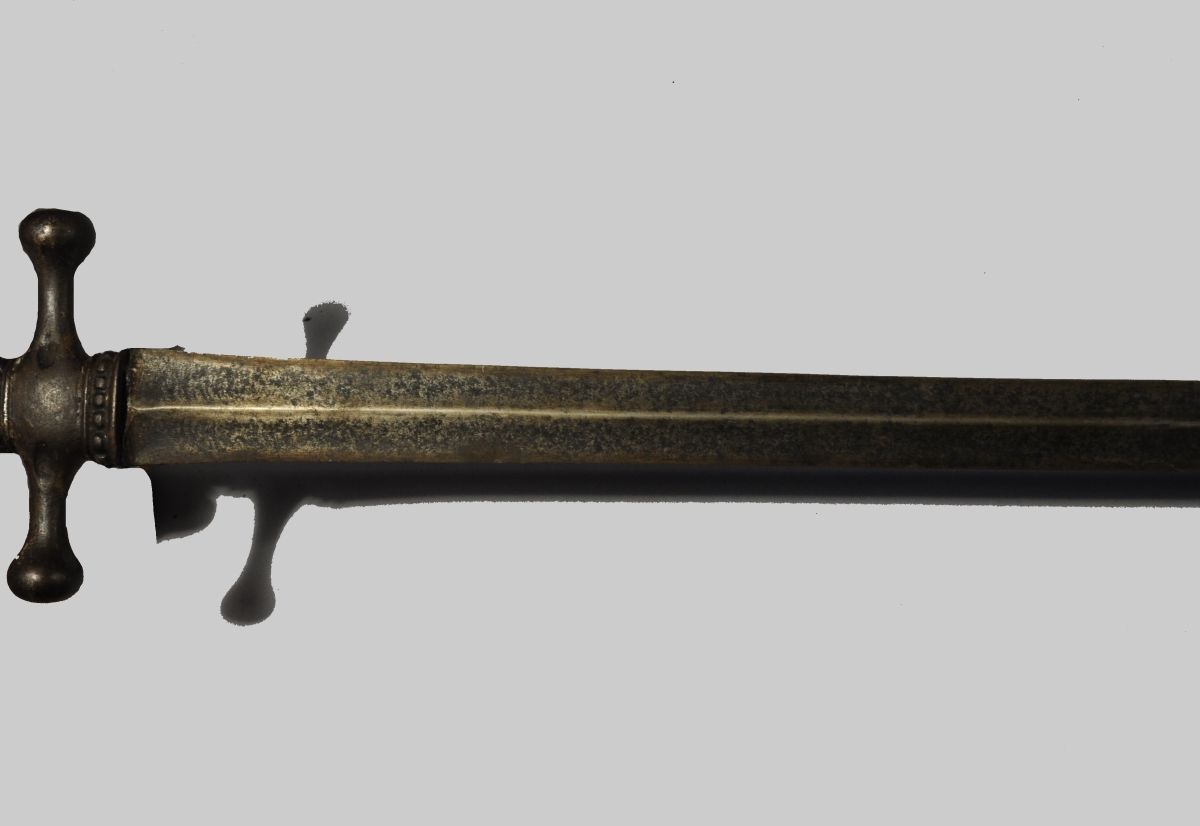 ÉPÉE. Garniture en fer, croisière droite à deux quillons terminés en boule applatie flanqués de rais de perle. Pommeau en boule applatie soulignée de rais de perle. Fusée en bois (fente). Lame droite à double tranchant présentant au talon des traces de gravure. Sans fourreau.