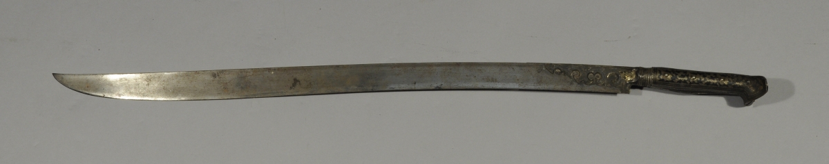 YATAGAN OTTOMAN. Poignée à oreillettes et talon en métal argenté et ciselé présentant un décor de rinceaux et volutes feuillagéesdans le goût du niel. Sans fourreau.