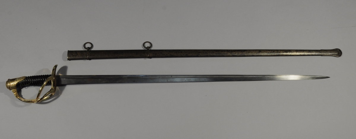 SABRE d'Officier de Cavalerie Lourde modèle 1822. Poignée en corne (manque le filigrane). Monture en laiton ciselée. Lame droite à double tranchant et forte gorge. Fourreau en tôle de fer à deux à deux bracelets de bélière et deux anneaux.