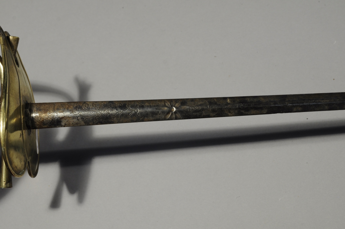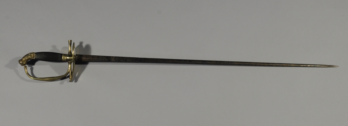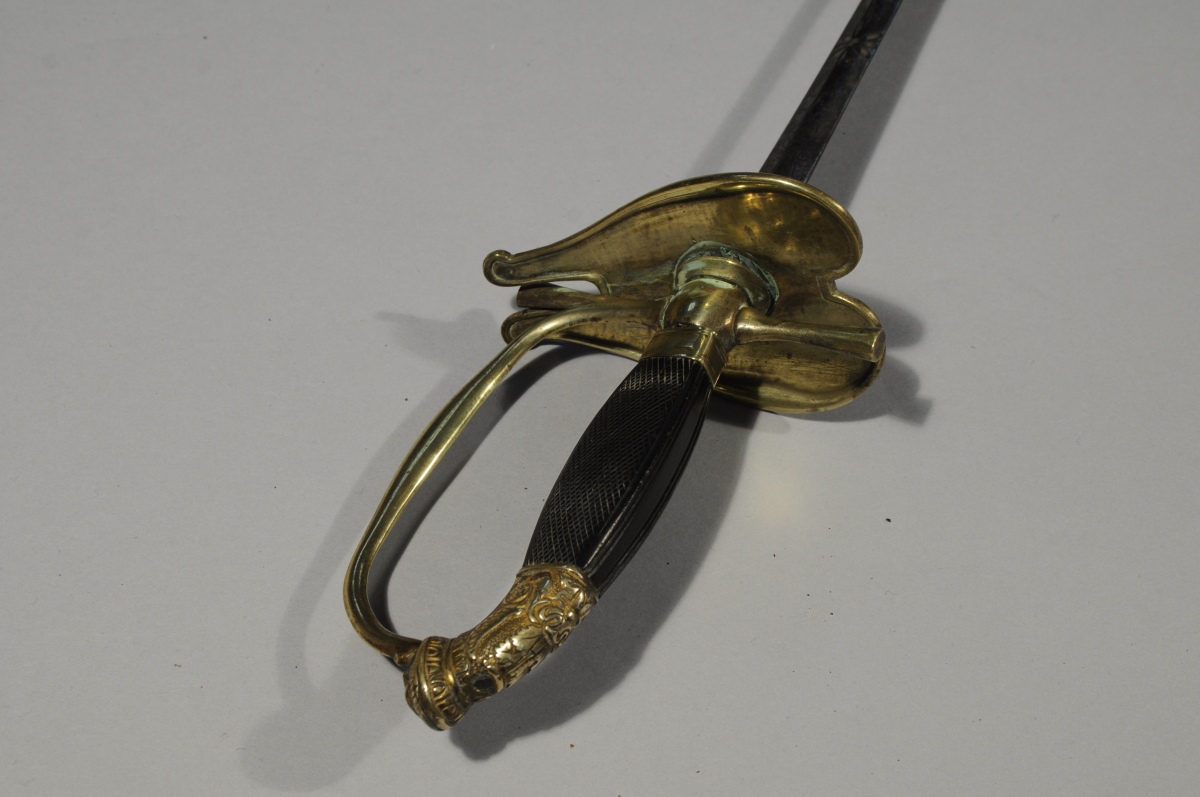 ÉPÉE D'OFFICIER, monture en laiton. Plateau en lyre, quillons droits élancés. Fusée en ébène guilloché (fente), pommeau en forme de crosse terminé par un mufle de lion mordant la branche. Lame plate ciselée au quart de motifs feuillagés. Sans fourreau.