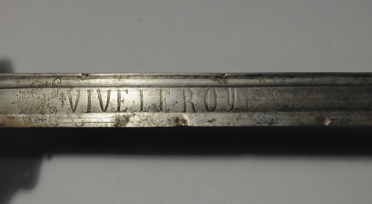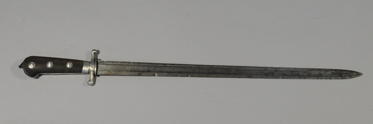 COUTEAU DE CHASSE, monture en argent. Croisière à deux quillons inversés. Poignée en crosse en ébène (fente) ornée de trois boutons d'argent. Importante lame droite à dos plat gravée d'un côté "Vive le Roy" dans un écusson fleurdelisé et de l'autre de l'écu de France couronné, d'un monogramme "CC" et d'un soleil. Poinçons aux Fermiers Généraux. Manque le fourreau.