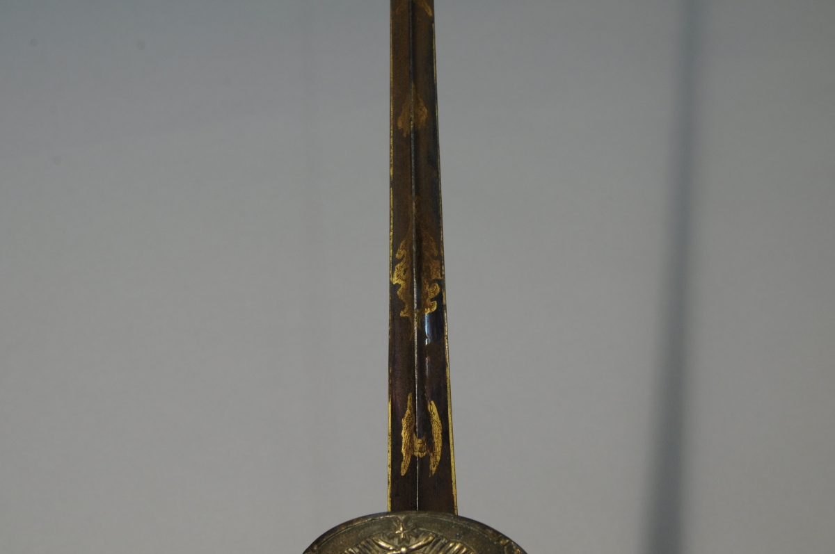 ÉPÉE D'OFFICIER, monture en laiton ciselé, clavier aux armes de la seconde maison d'Artois, surmontées de la couronne royale et flanquées de palmes sur fond de gloires rayonnantes. Fusée à plaquettes de nacre cannelées, pommeau en forme de crosse terminé par un mufle de lion mordant la branche ornée d'une fleur de lys. Lame triangulaire, dorée et bleuie au tiers, signée au talon: "IGB". Fourreau de cuir (mauvais état, manque les garnitures).