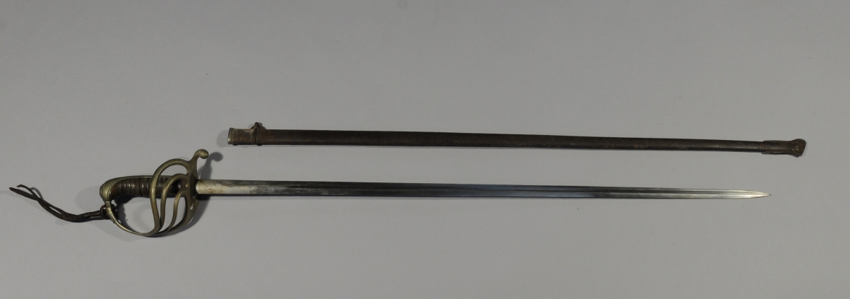 SABRE d'officier d'infanterie, modèle 1882. Poignée en corne filigranée (manques). Monture en métal à une branche principale et trois secondaires. Quillon recourbé. Pommeau monogrammé "BS". Lame droite à double tranchant et gorge. Fourreau en tôle de fer à un bracelet de bélière et un anneau.