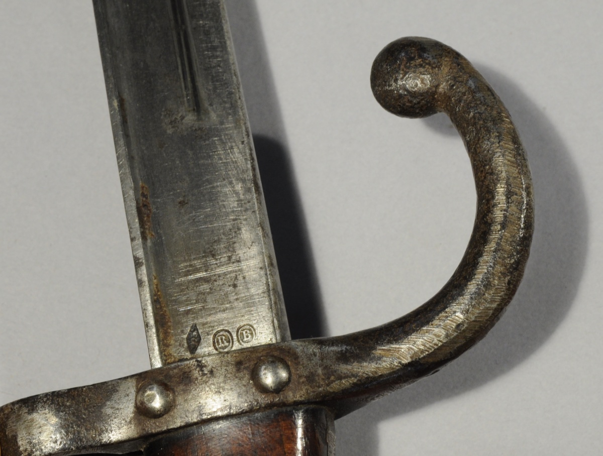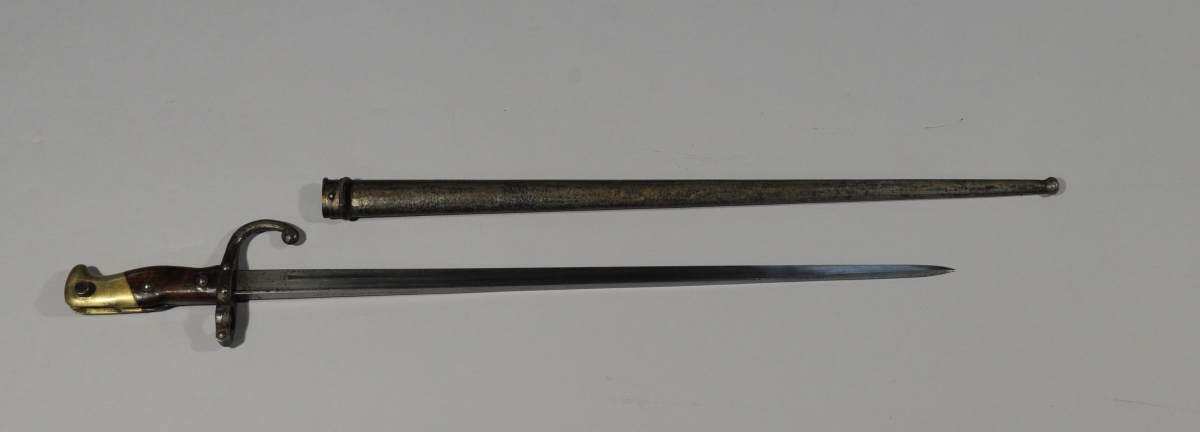 BAÏONNETTE GRAS, modèle 1874. Poignée en laiton et plaquettes de noyer. Garde en fer. Lame gravée "Mre d'Armes de Châtt Janvier 1883". Fourreau en fer au même numéro "59330".