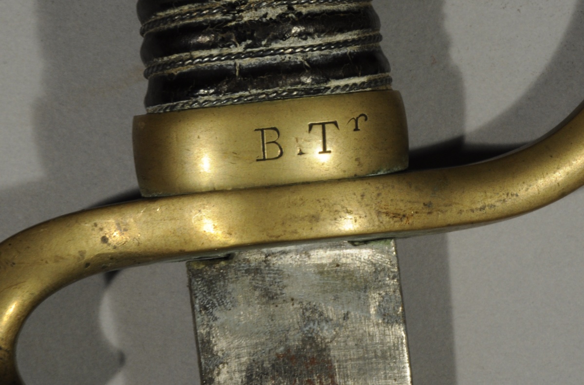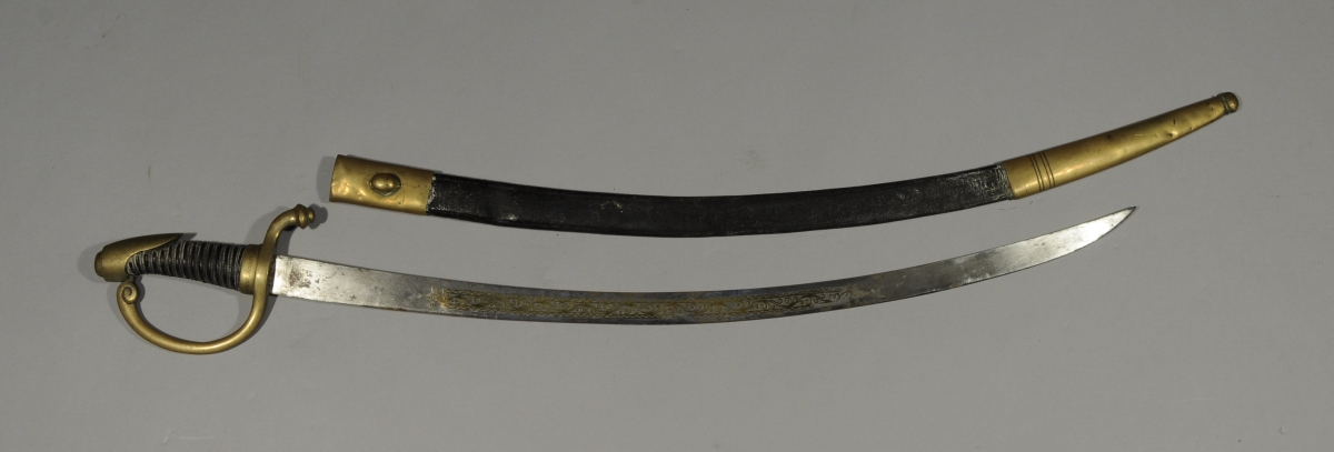 SABRE. Poignée gaînée de basane filigrannée. Monture en laiton gravée Honneur / Amour / Patrie / B. Tr". Branche simple et quillon recourbé. Lame courbe à dos plat ciselée en son centre de volutes dorées. Fourreau en cuir noir à deux garnitures de laiton.