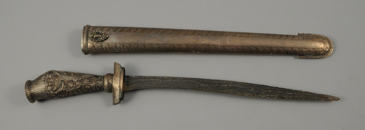 POIGNARD, poignée métal rose ornée de motifs végétaux tels que volutes feuillagées et fleurs stylisées. Lame courbe en acier pamor. Fourreau en bois et métal rose ciselé et marqué "89/7 / 3 / BB".