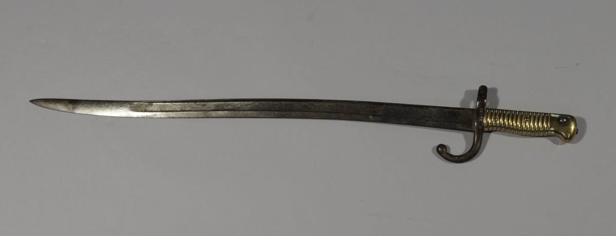 BAÏONETTE CHASSEPOT modèle 1866. Poignée en laiton. Croisière en fer avec numéro de matricule et poinçons. Lame signée "Mre d'Armes de St Etienne Août 1873". Sans fourreau.