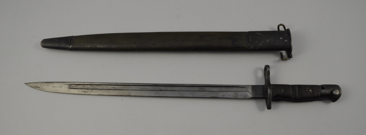 ÉTATS-UNIS D'AMÉRIQUE. BAÏONNETTE REMINGTON modèle 1917. Monture en métal noirci et fusée à plaquettes de bois. Lame droite à dos arrondi et large gorge marquée au talon "1917 Remington", "US"et frappée de la tête d'aigle, de la grenade et du chiffre 20. Fourreau en cuir vert kaki à deux garnitures en métal noirci. La bouterolle marquée "GF".