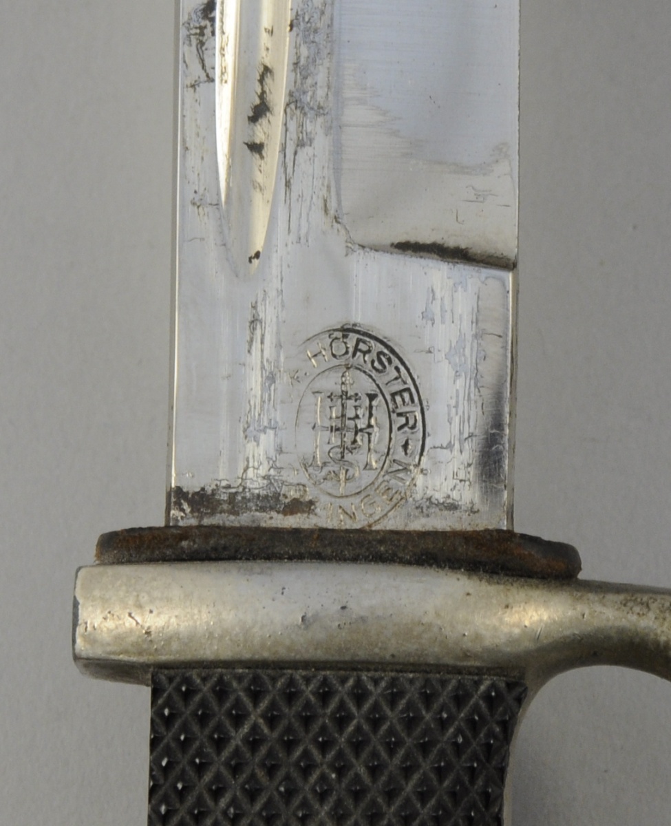 ALLEMAGNE. BAÏONNETTE de tenue de sortie, modèle 1898. Poignée en métal nickelé à plaquettes d'ébonite guillochée. Un quillon recourbé. Marquée au talon "Hörster Solingen". Fourreau en métal laqué noir (oxydations). Étui en cuir noir.