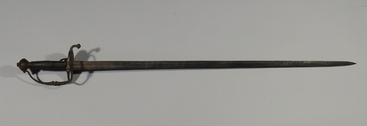 WALLONNE DE CAVALERIE. Monture fer à une branche à boules et quillon recourbé. Pontat à grille perforée et pièce de pouce. Fusée entièrement filigranée. Lame de Solingen à double tranchant et gorge centrale au talon signée IOHANNI. Sans fourreau.