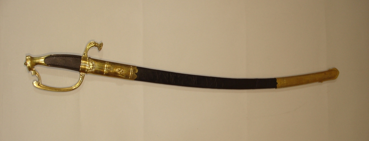 SABRE D'OFFICIER D'INFANTERIE modèle 1800. Poignée en ébène à quadrillage en losange. Garde à une branche, deux demi-oreillons et quillon en fleur. Lame courbe à dos plat, contre-tranchant et pans creux, gravée au tiers d'attributs militaires et rinceaux. Bouton de chape ornée d'une fleur de lys. Fourreau en cuir à deux garnitures en laiton découpé. Dard en fer.
