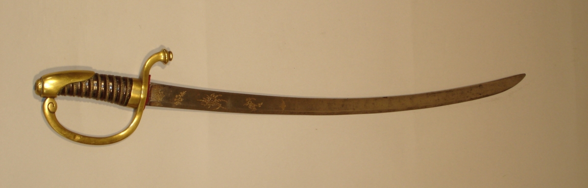 SABRE AU MODÈLE DES BRIQUETS DE LA JEUNE GARDE IMPÉRIALE. Poignée recouverte de basane avec filigrane. Garde à une branche à quillon recourbé, monté avec une courte lame d'officier, gravée au tiers de fleurs, feuillages et attributs militaires.