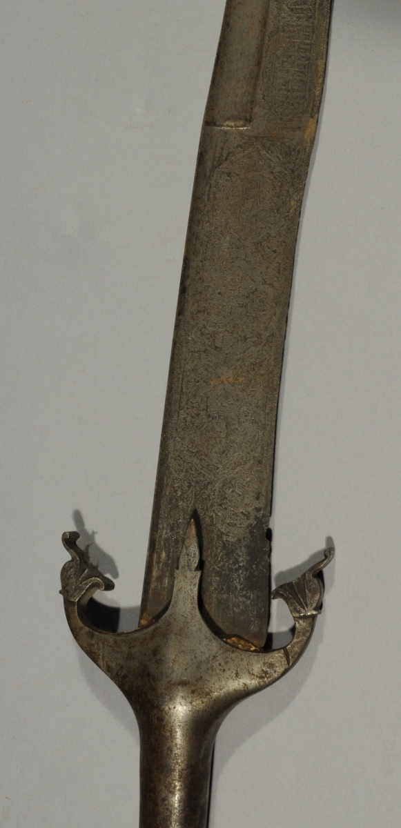 SABRE PERSAN. Poignée crosse en métal, garde à quillons abaissés à extrémités àmotif floral stylisé. Lame courbe à dos plat, contre-tranchant et large gorge entièrement gravée à l'eau forte de personnages, de rinceaux feuillagés et d'inscriptions. Sans fourreau.