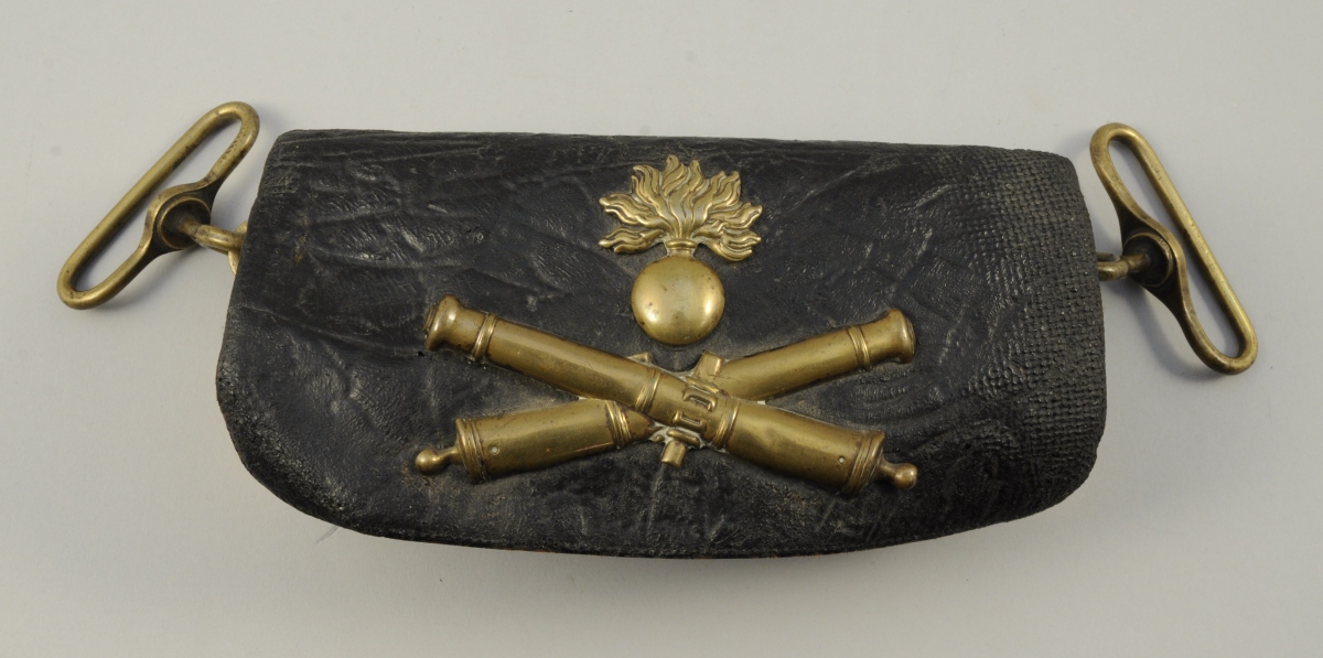 GIBERNE D'ARTILLEUR À PIED en bois noici, cuir noir verni et garnitures en laiton. Attache en cuir cassée.