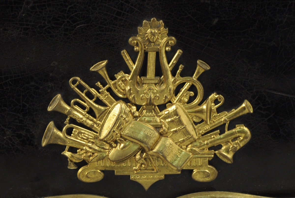 DEUX GIBERNES à partitions en cuir noir verni. Garnitures en laiton doré telles que trophée d'instruments de musique et liseré.