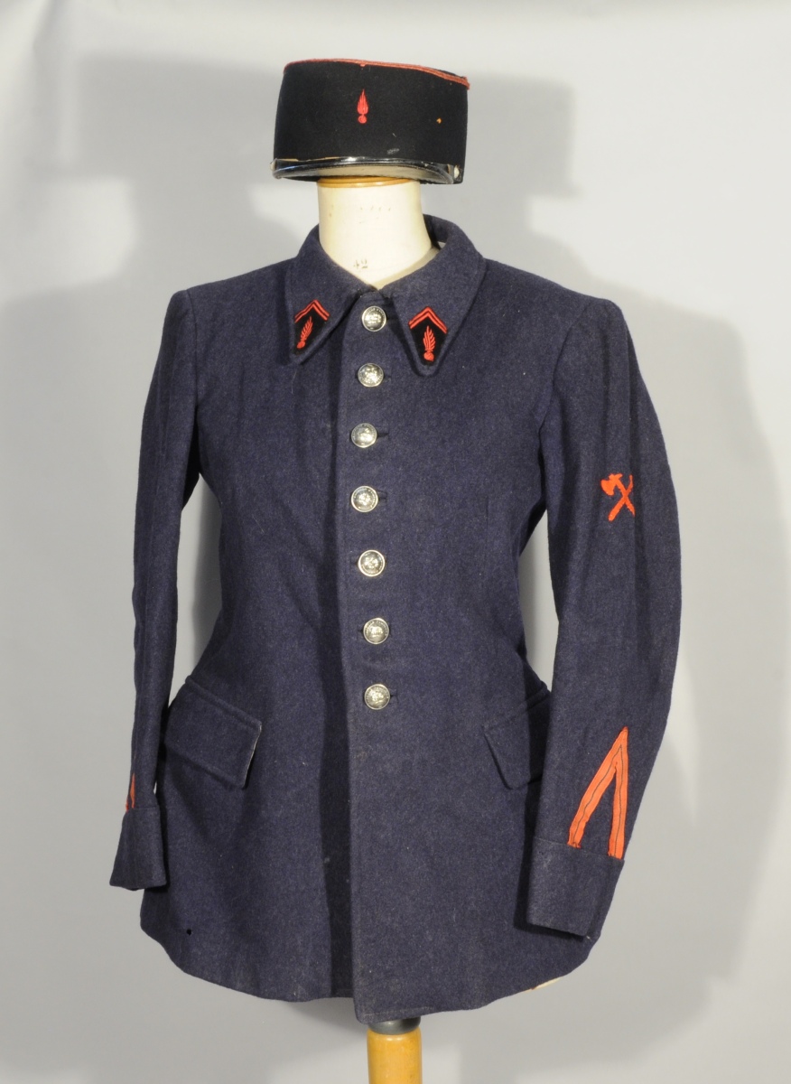 TROIS VESTES DE SAPEUR-POMPIER en feutre bleu. Insignes de col à la grenade, galons rouges. Insigne aux deux haches croisées sur la manche gauche sur deux vestes. Cousues d'une étiquette "Tailleur / À la Belle Jardinière / Mon Godard & Cie / Blois".