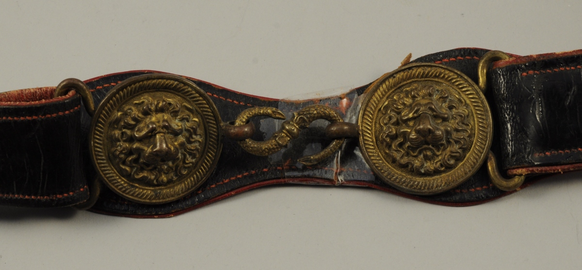 CEINTURON PORTE-ÉPÉE en cuir noir et maroquin rouge au revers. Boucles au mufle de lion en laiton. Attache en "S" à la tête d'aigle.