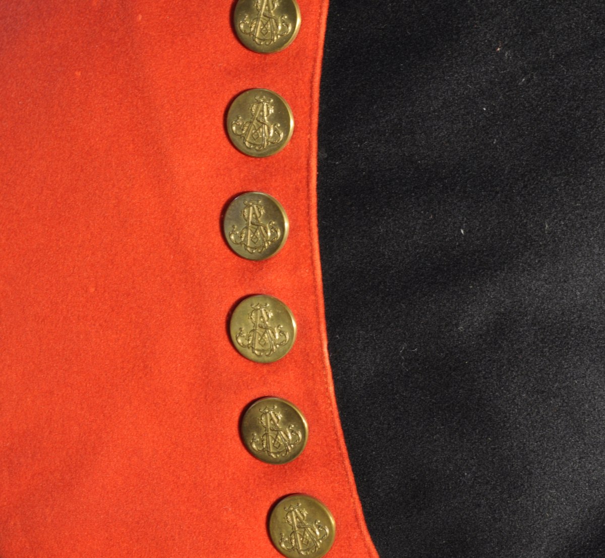 Belle LIVRÉE DE DOMESTIQUE. Veste en drap noir à parements rouges et galons or. Gilet de drap rouge et galons or. Complet de leurs boutons en bronze monogrammés "AS". Culotte noire à la française, une guêtre de drap rouge à bande noire.