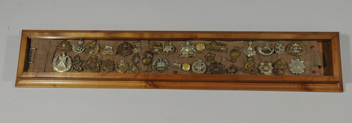 COLLECTION de 35 INSIGNES ou BOUTONS de régiments du Royaume-Uni, des États-Unis d'Amérique et du Commonwealth tels que: Manchester, East Surrey, South Lancashire, East Yorkshire, Cameron, Canadian Army Service Corps, 3rd (Auck) Regiment. N.Z. Infantry, Northumberland Fusiliers...