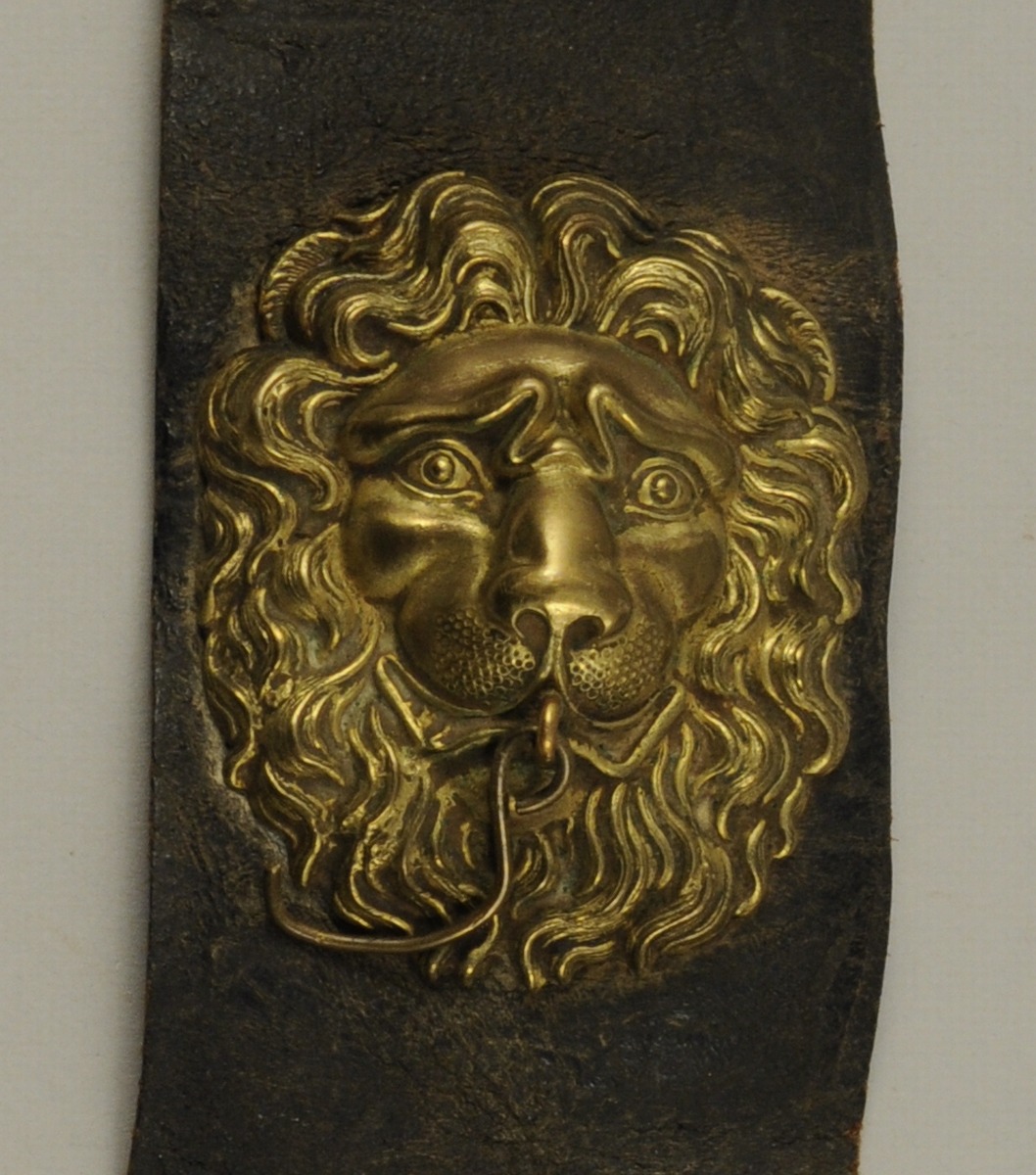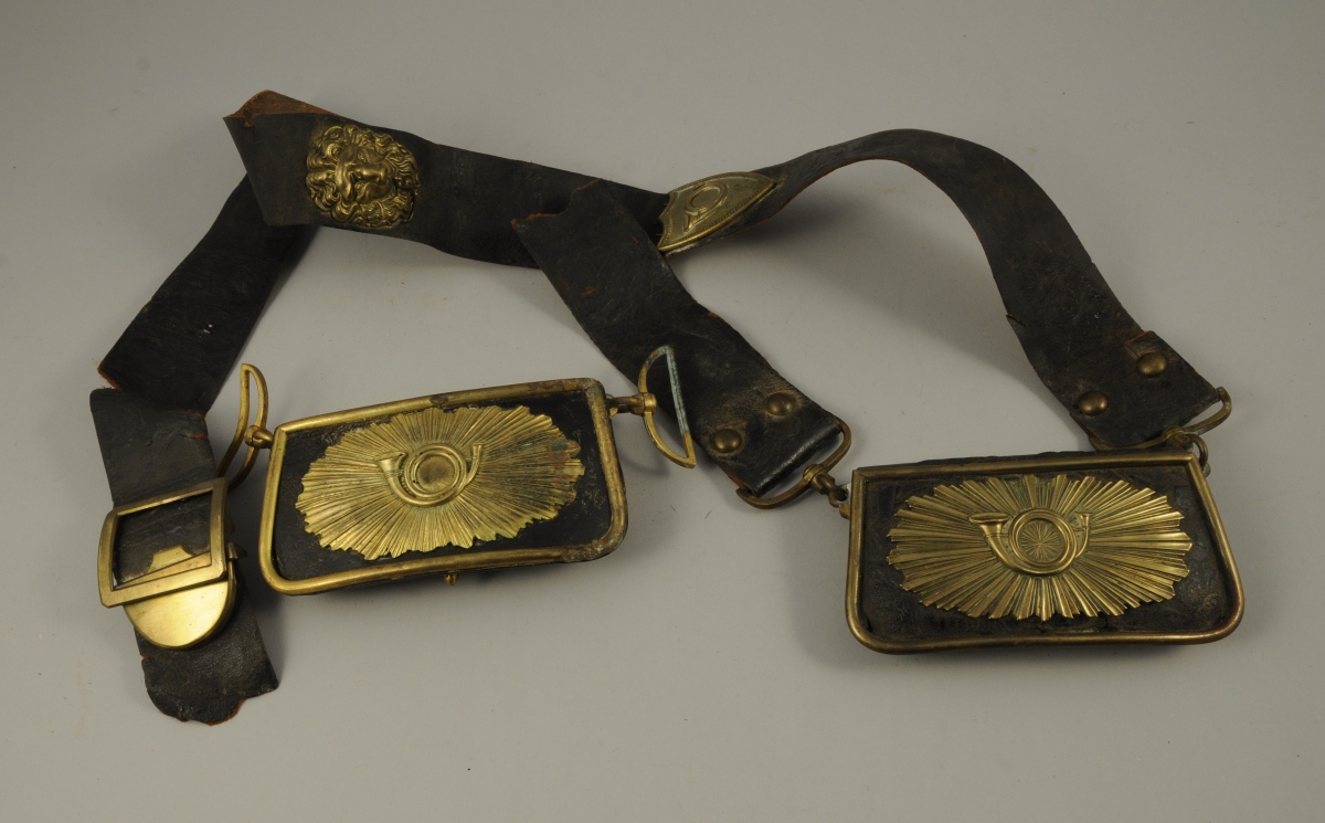 L'une des deux gibernes conserve sa bandoulière (brisée) en cuir noir à boucle et garnitures de laiton estampé et doré figurant le cor de chasse dans un écu et un mufle de lion.