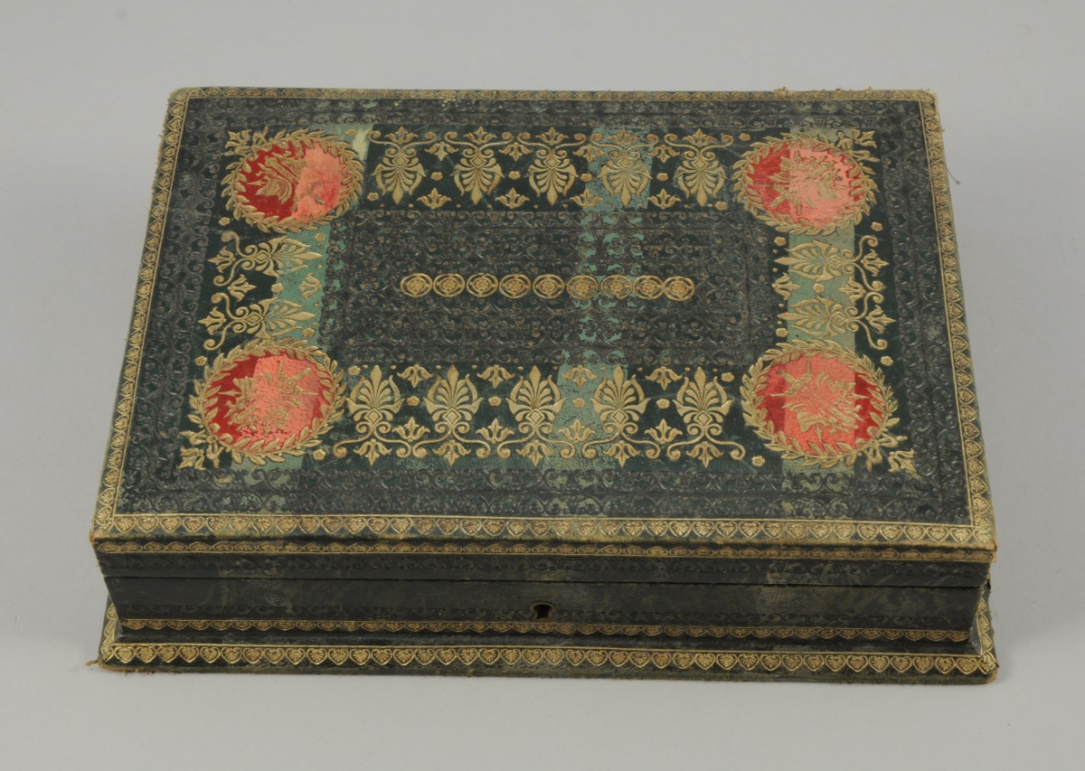 COFFRET de forme rectangulaire en cuir vert richement gauffré et doré aux petits fers. Motifs de rinceaux, écoinçons, fleurettes et palmettes stylisées. Le couvercle présente, aux quatres coins, des cercles encadrés d'une courone de laurier contenant des trophées d'armes dorés sur fond de cuir rouge.