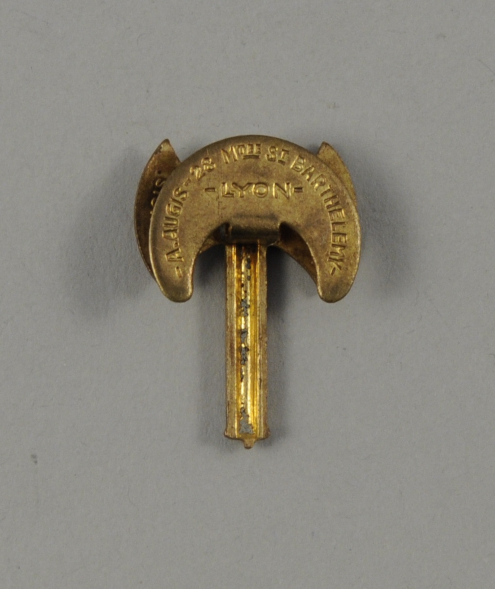 Insigne pour boutonnière en laiton et émail bleu, blanc et rouge représentant le bâton de maréchal émaillé de bleu, à 10 étoiles et extrémités en laiton, constituant le manche où s'attachent deux fers émaillés tricolore.