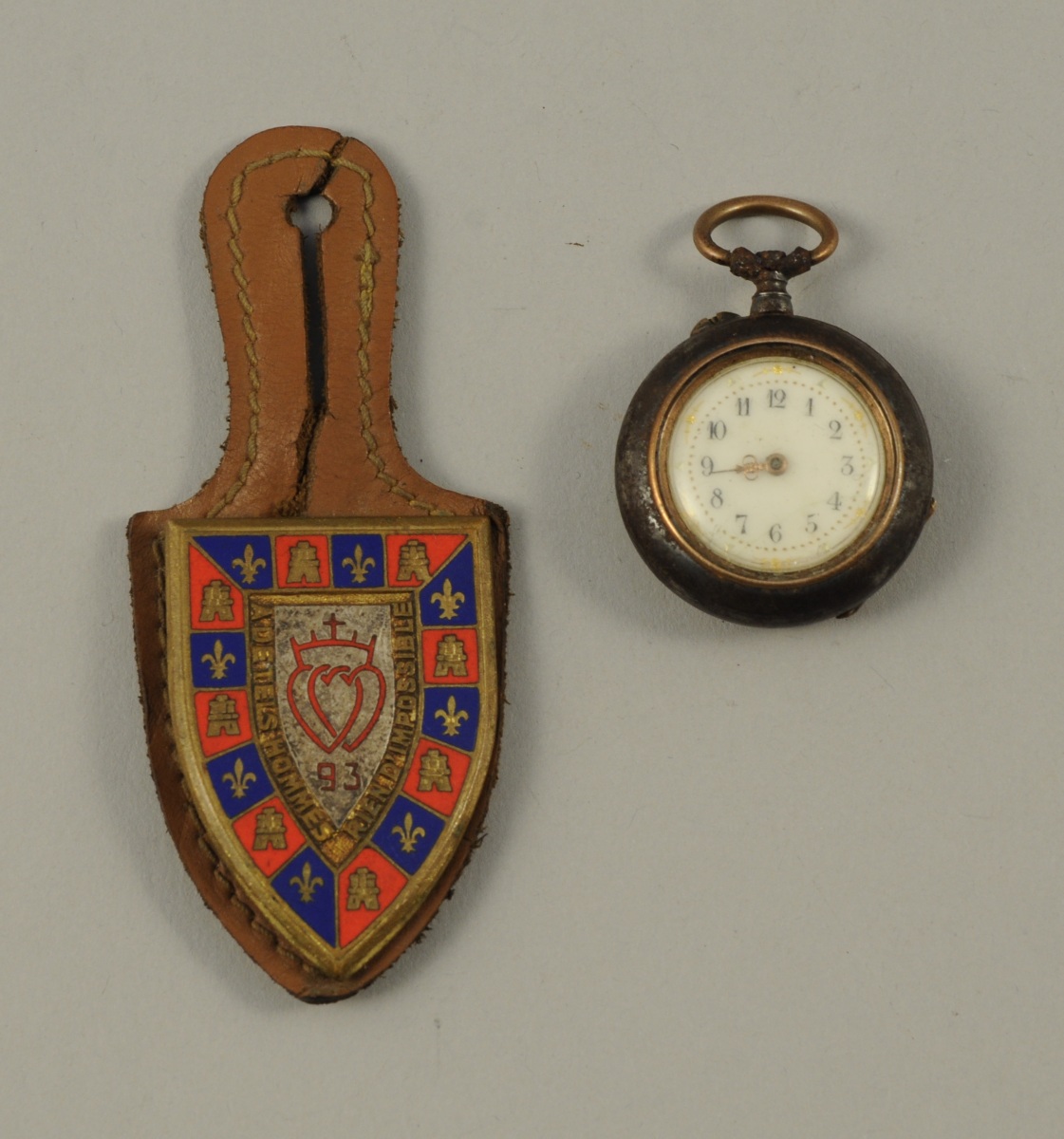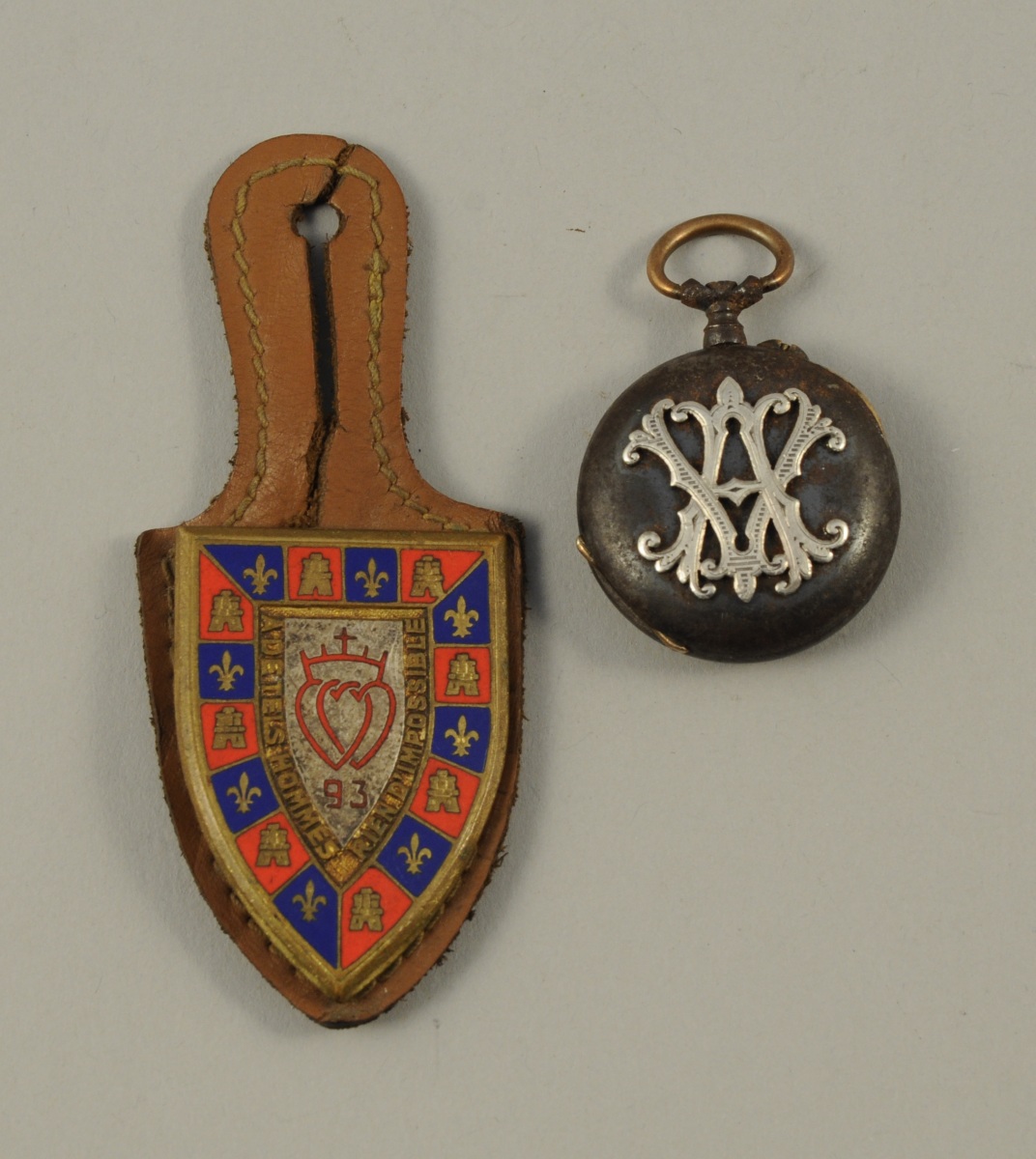 Une MONTRE DE GOUSSET en métal patiné. Remontoir au pendant, cadran émaillé blanc indiquant les heures en chiffres arabes. Le dos du boîtier monogrammé "AV". Fin du XIXème. Diam. 2,8 cm.