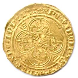 R/. Croix aux bras fleurdelisés dans un quadrilobe orné de fleurs de lis et cantonné de couronnelles. Ponctuation par étoiles. Etoile au centre. Apostrophes après XPC.