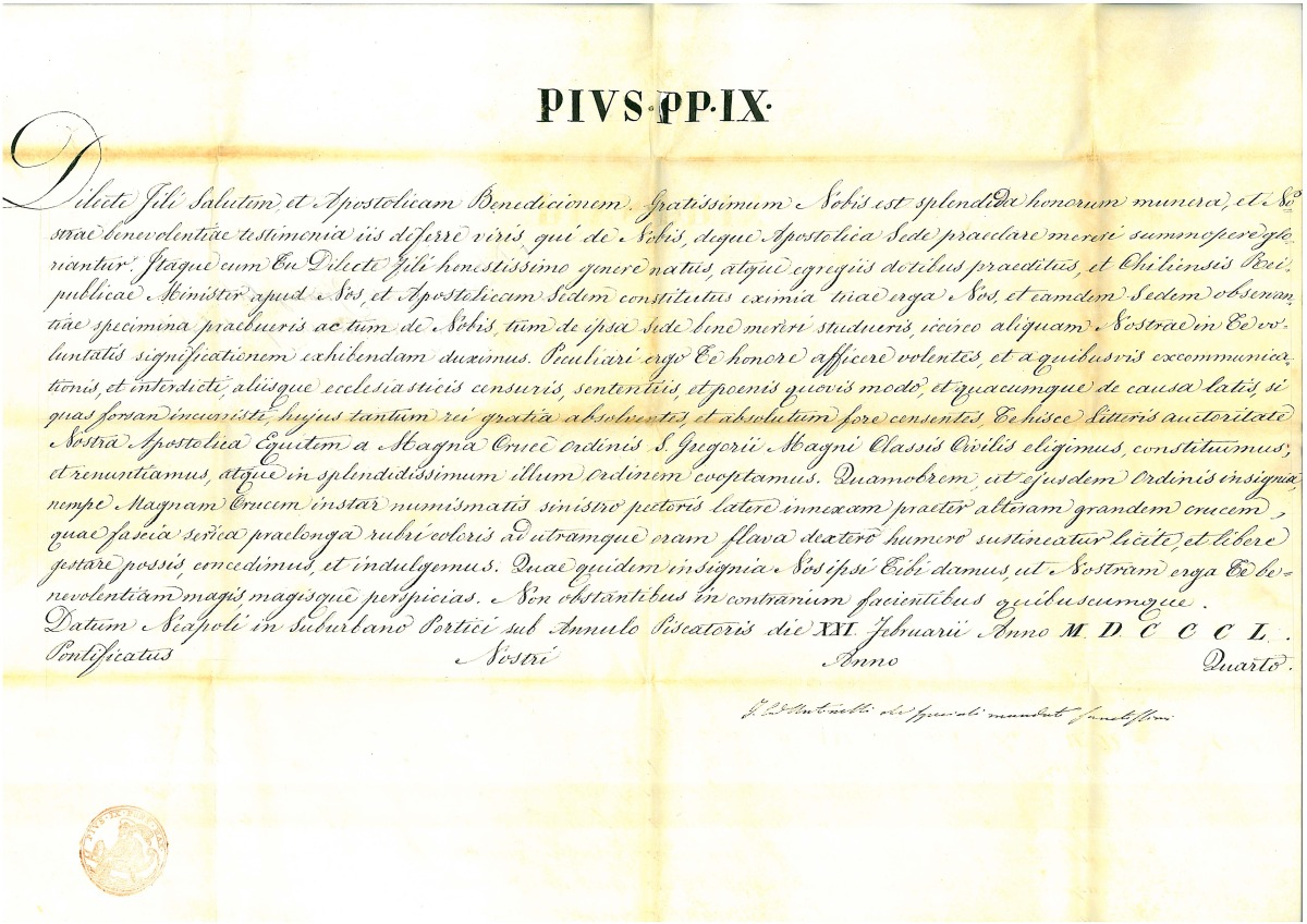 - Bref pontifical de nomination sur vélin, entièrement manuscrit, en latin, donné à Portici, banlieue (sic) de Naples le 21 février 1850, signé Antonelli, scellé à l'encre rouge du sceau du pêcheur de Pie IX.