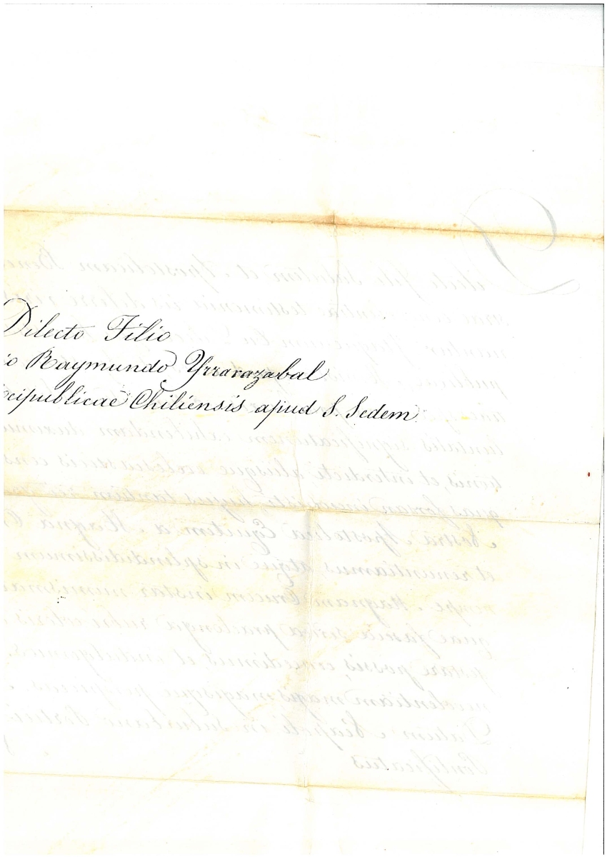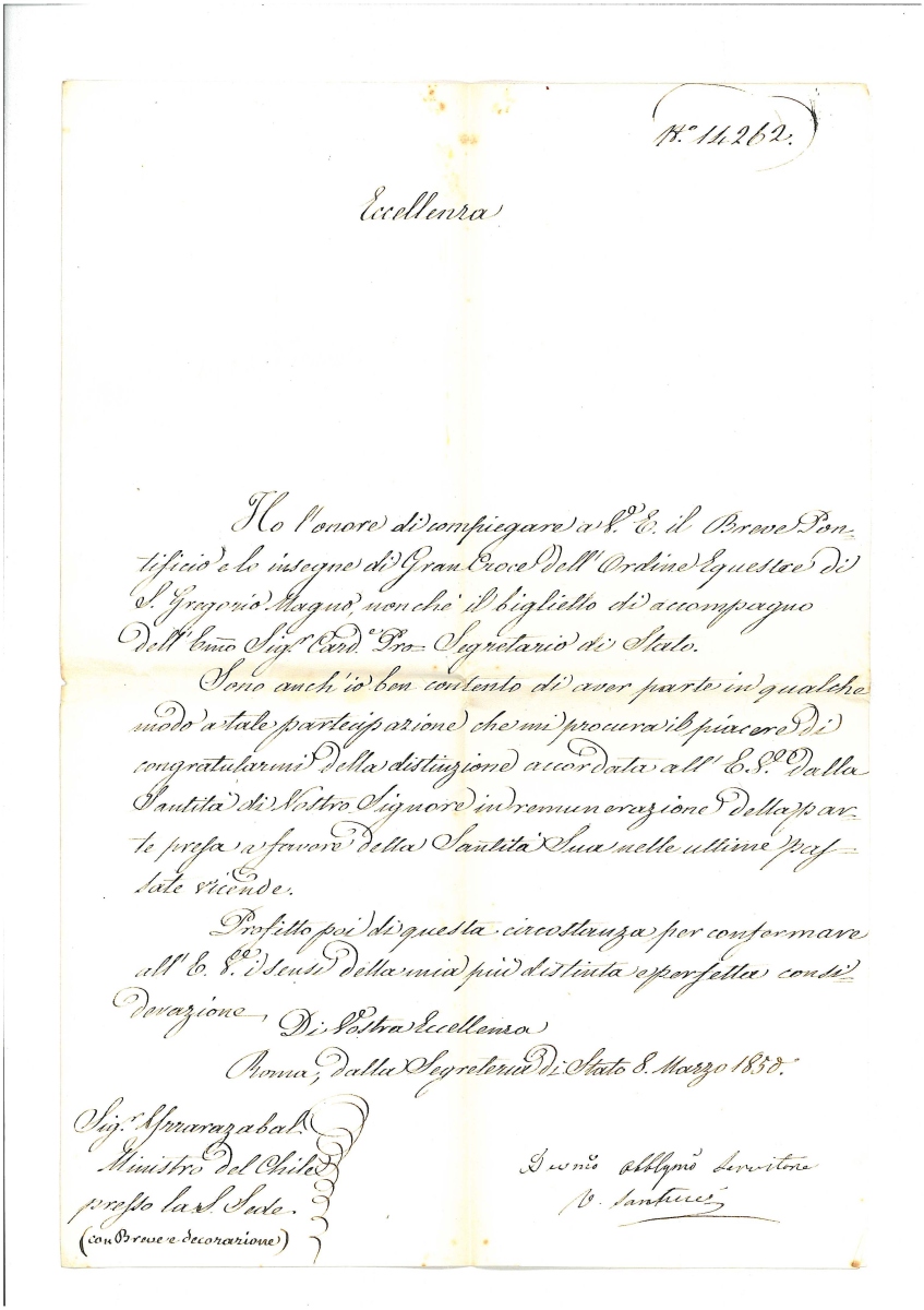 - Lettre d'accompagnement des services du Secrétariat d'État, entièrement manuscrite, en italien, établie à Rome le 8 mars 1850, accompagnant le bref pontifical, les décorations et la lettre du cardinal Antonelli.