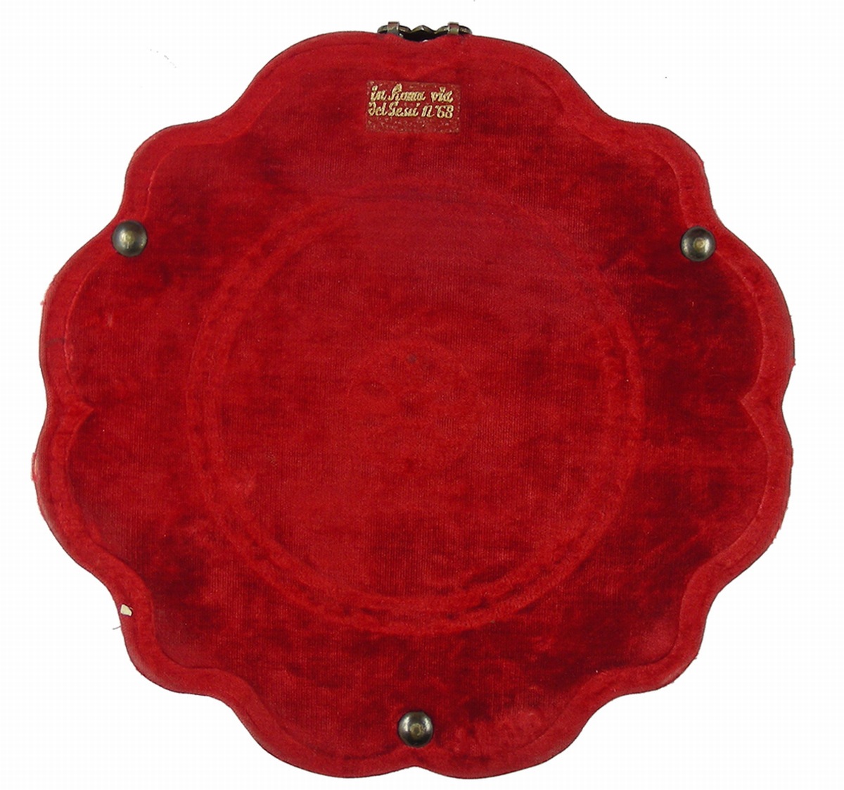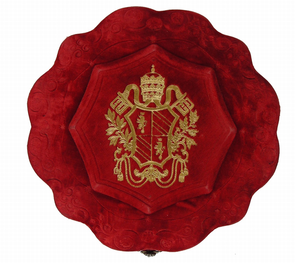 Dans un écrin de forme mouvementée, recouvert de velours pourpre, le couvercle gaufré de motifs rocaille et frappé aux armes de Pie IX, fermoir en argent terminé en coquille, intérieur gainé de satin et de velours violet, en dessous, une petite étiquette en cuir porte l'adresse du gainier frappée à l'or, in Roma via del Gesu N 68.