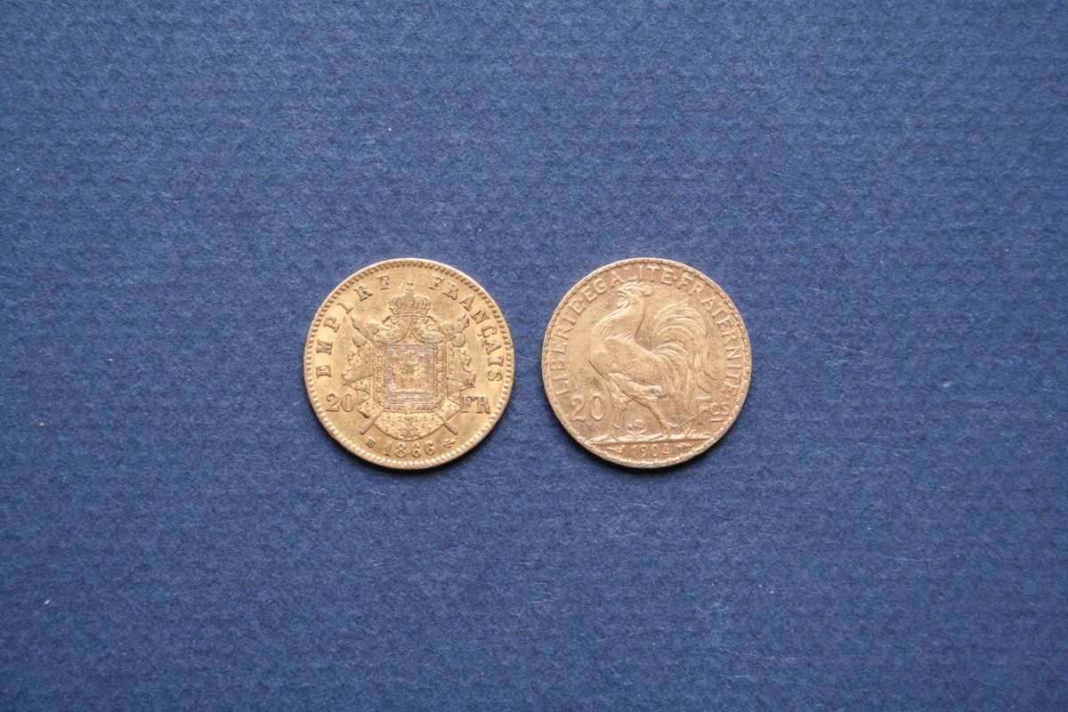 Lot, France, 2 pièces de 20 F or (Napoléon tête laurée, 1866 et coq, 1904) TTB