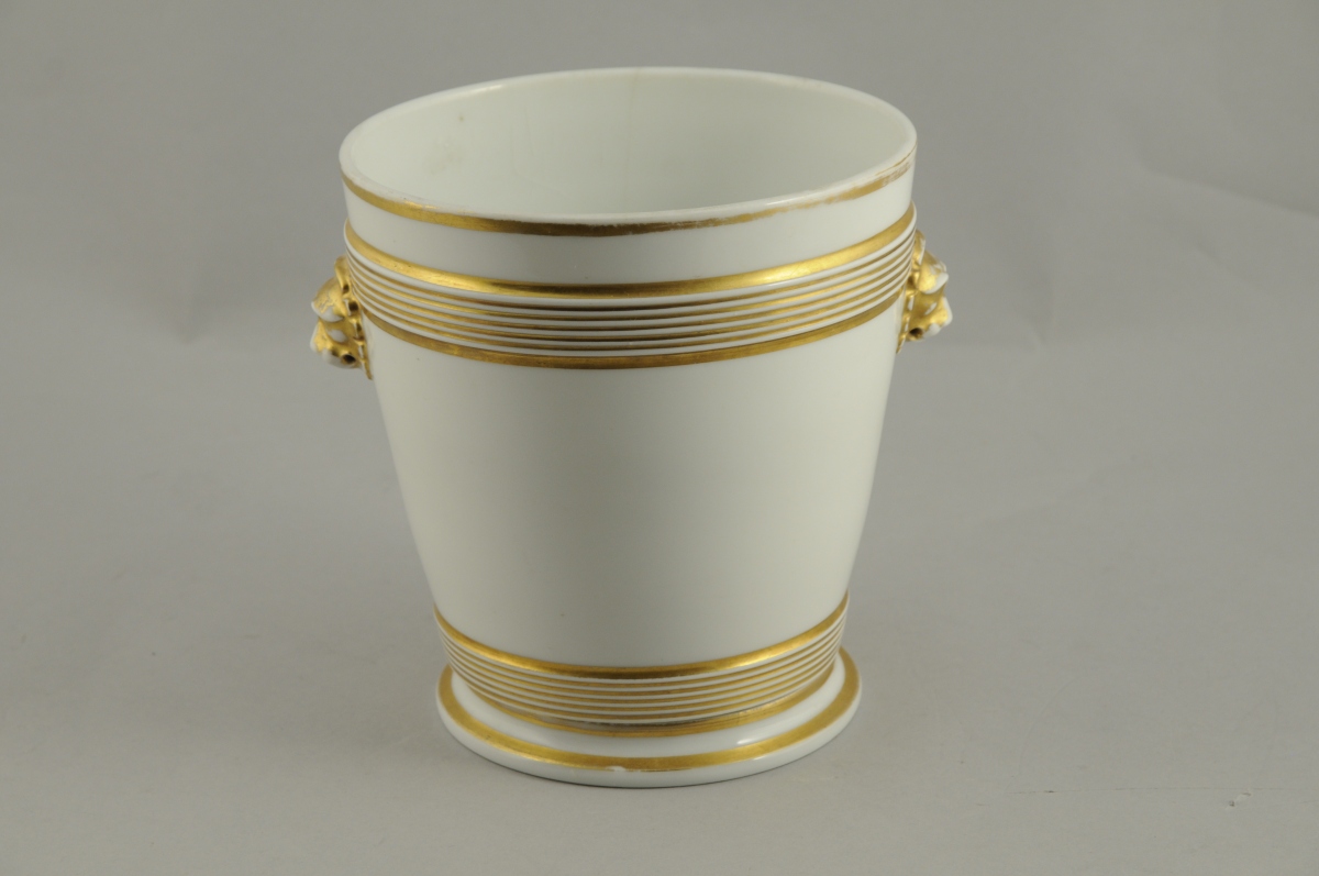 CACHE-POT en porcelaine blanche rehaussée de filets or. Deux anses en têtes de lions or. Socle circulaire. XIXème. Haut. 20,3 cm. (usures à l'or)