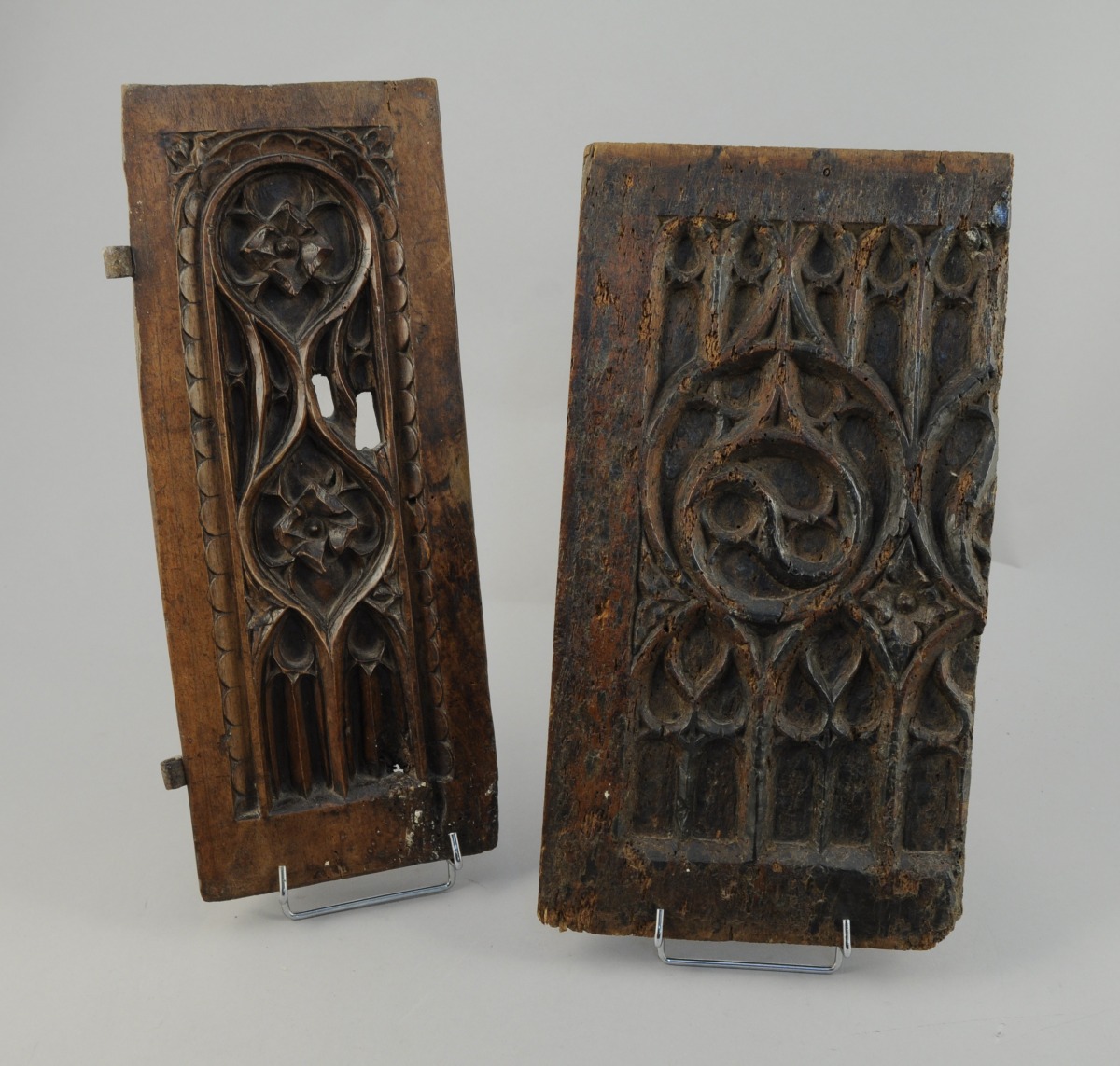 DEUX PANNEAUX en bois sculpté à décor gothique d'ogives et de fleurs stylisées. Travail ancien. L'un présente deux fiches sur le côté droit et des trous d'entrée de serrure. Haut. 39, Larg. 21 et Haut. 40, Larg. 15 cm.