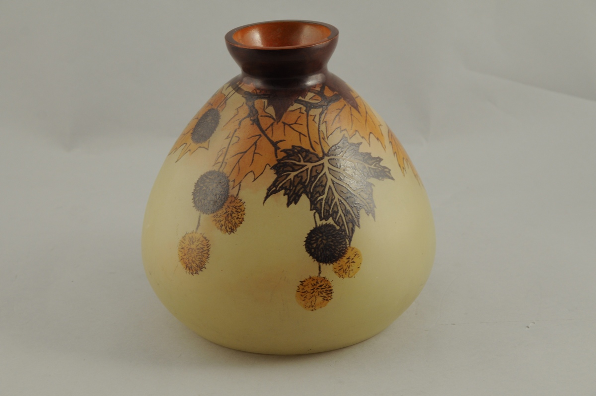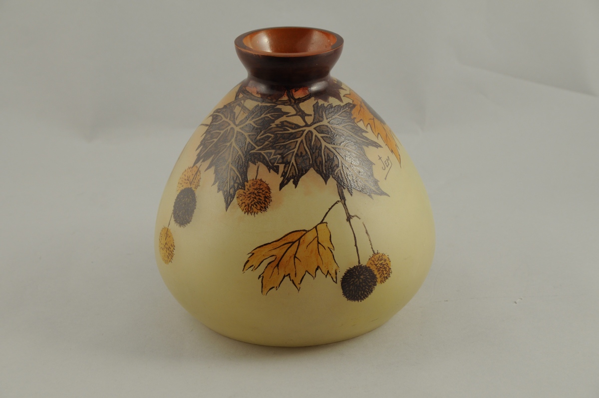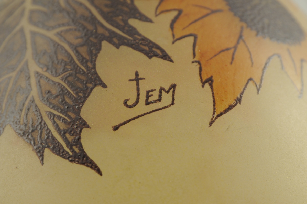 LEGRAS. Vase en verre soufflé de forme ovoïde, à décor de châtaignes et branchages automnaux dans les tons bruns et orangé émaillés sur fond opalescent jaune orangé. Signé "JEM" pour Legras (François Théodore, 1839-1916). Début XXème. Haut. 23 cm.