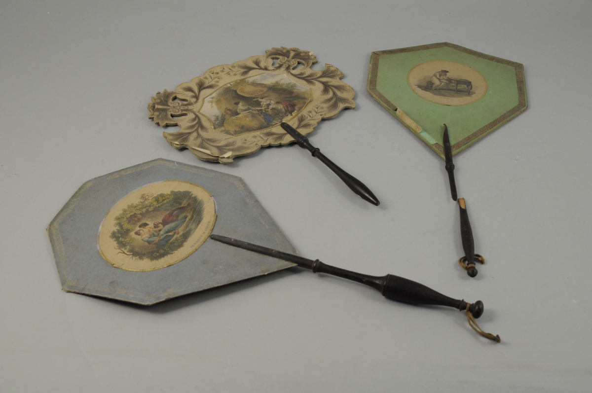 -Un de forme chantournée. La feuille centrée d'une gravure aquarellée figurant deux bergères et une chèvre animant un paysage rocheux. Encadrement de feuilles d'acanthe et fleurs stylisées en grisaille. Manche en bois tourné et noirci. Haut. 31,2, Larg. 24,5 cm.
