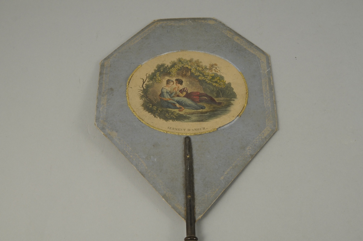 -Un de forme heptagonale. La feuille de couleur bleue centrée d'une gravure aquarellée de forme ovale représentant deux jeune gens au bord d'un lac titrée "SERMENT D'AMOUR". Manche en bois tourné et noirci. Haut. 42 Larg. 20 cm.