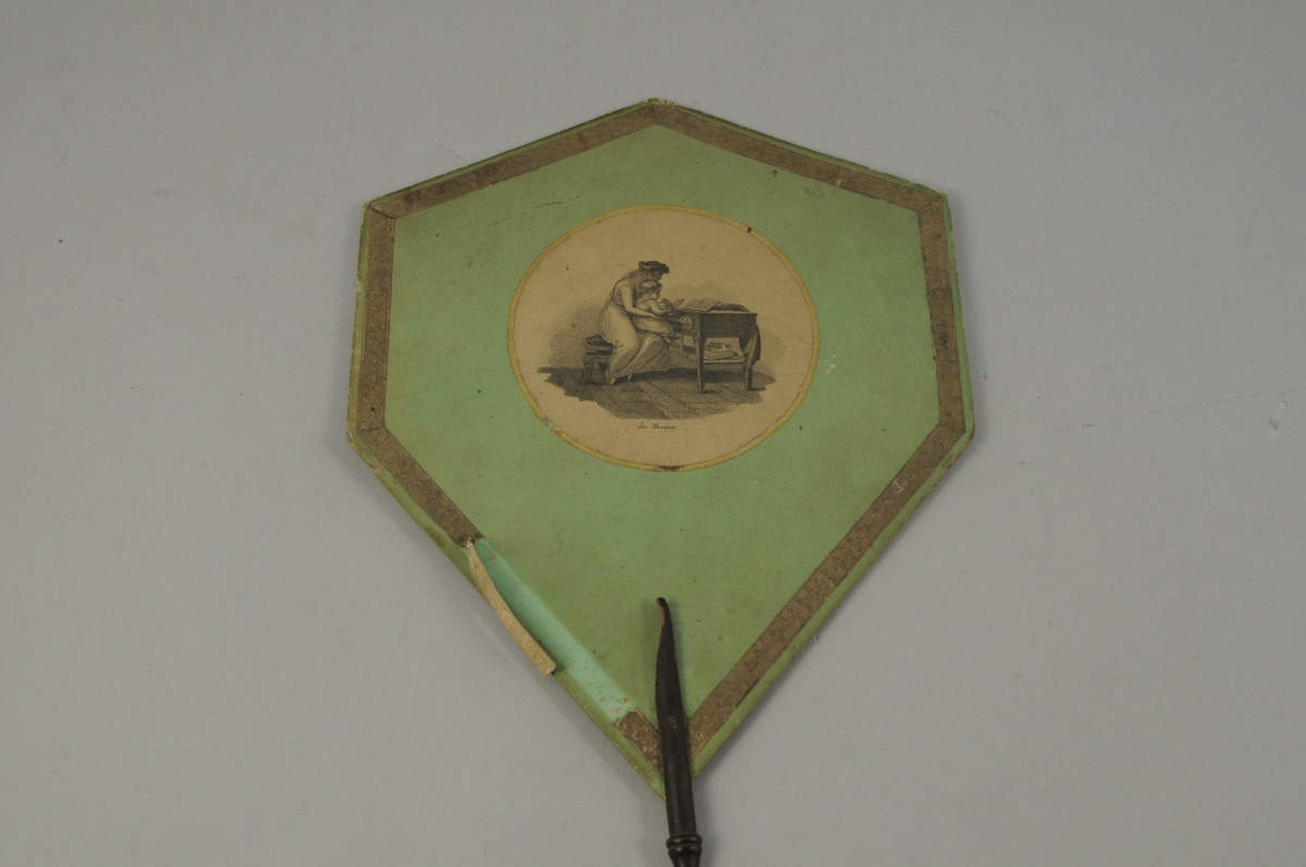 - Un de forme hexagonale. La feuille de couleur verte centrée d'une gravure de forme ronde représentant une femme apprenant à jouer du piano à son enfant titrée "La Musique". Contours en papier gaufré. Manche en bois tourné et noirci. Haut. 40 Larg. 19 cm.