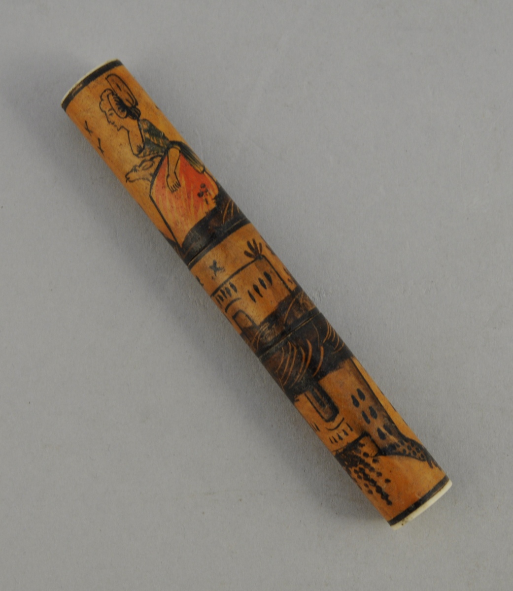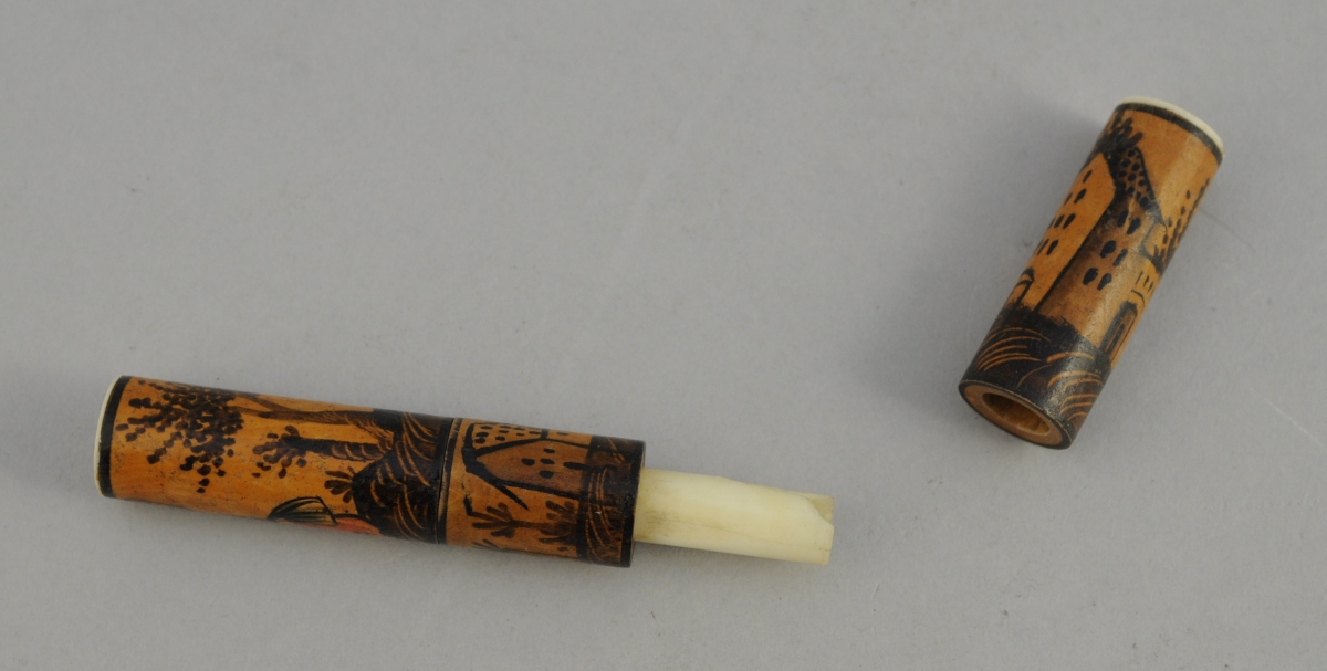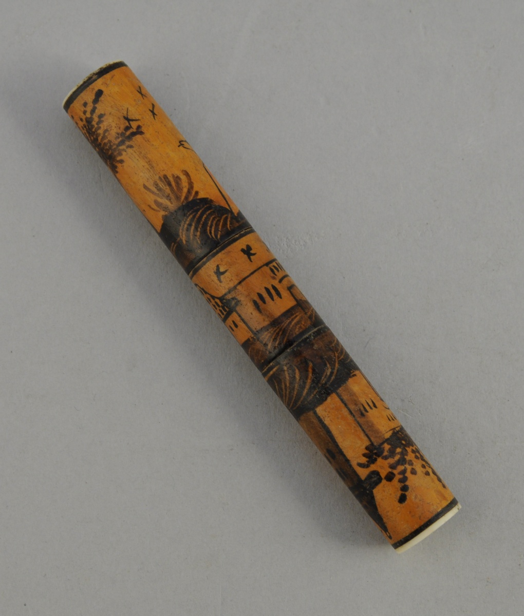 BILLET DOUX en bois peint et verni représentant un château et une dame de qualité. Les pans et le tube interne en os. Fin XVIIIème - début XIXème. Long. 11,1, Diam. 1,1 cm.