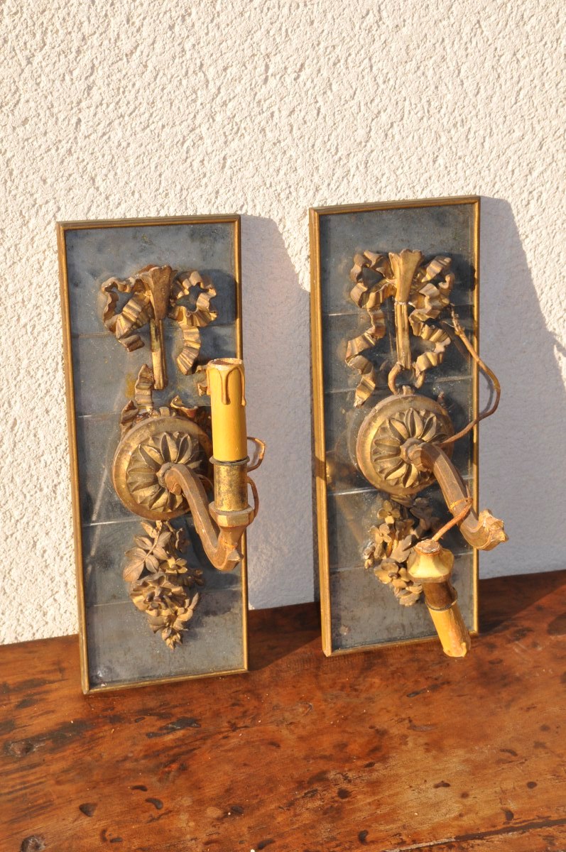 -PAIRE D'APPLIQUES à un bras lumière de forme mouvementée en bois sculpté et doré à décor de noeud rubanné, d'une rosace et d'une chute de fleurs. Les appliques sont fixées sur un panneau rectangulaire foncé de miroirs. Style Louis XVI. Haut. 41, Larg. 15, Prof. 20,5 cm. (électrifiées, accidents, manques et restaurations)