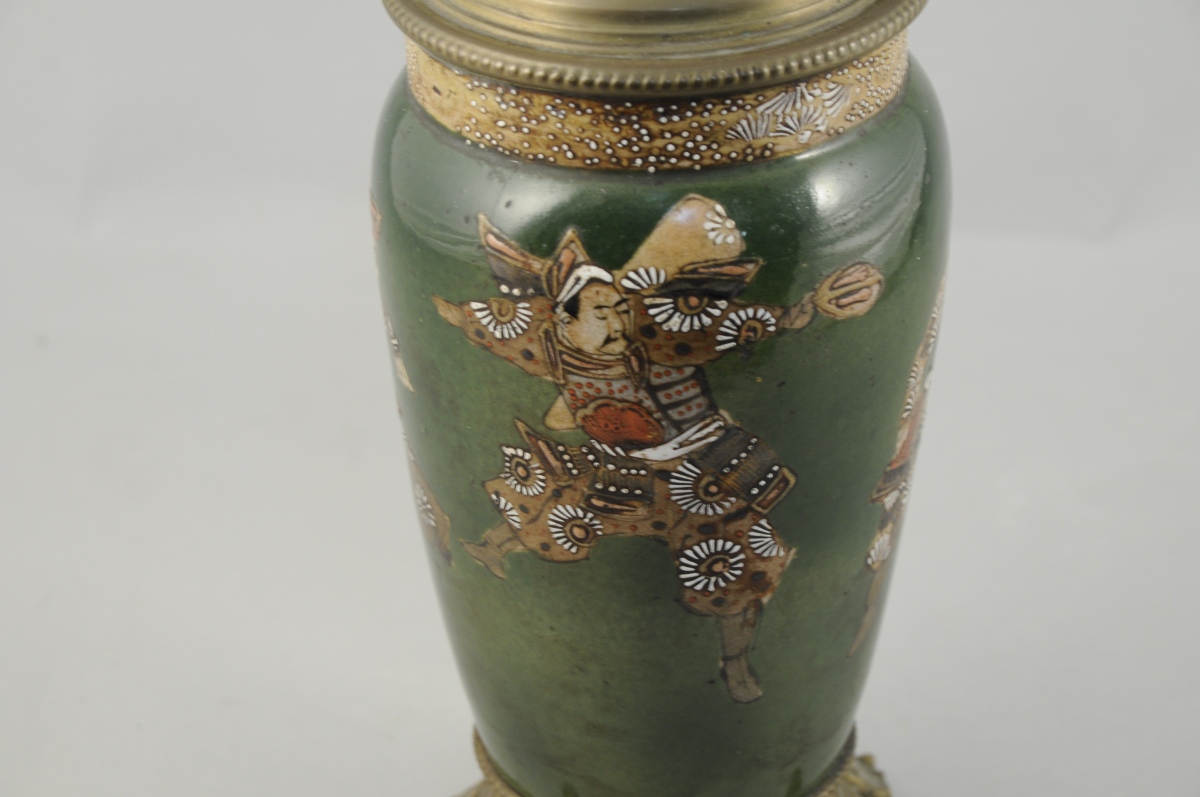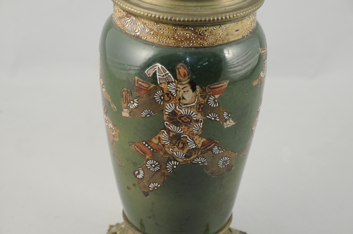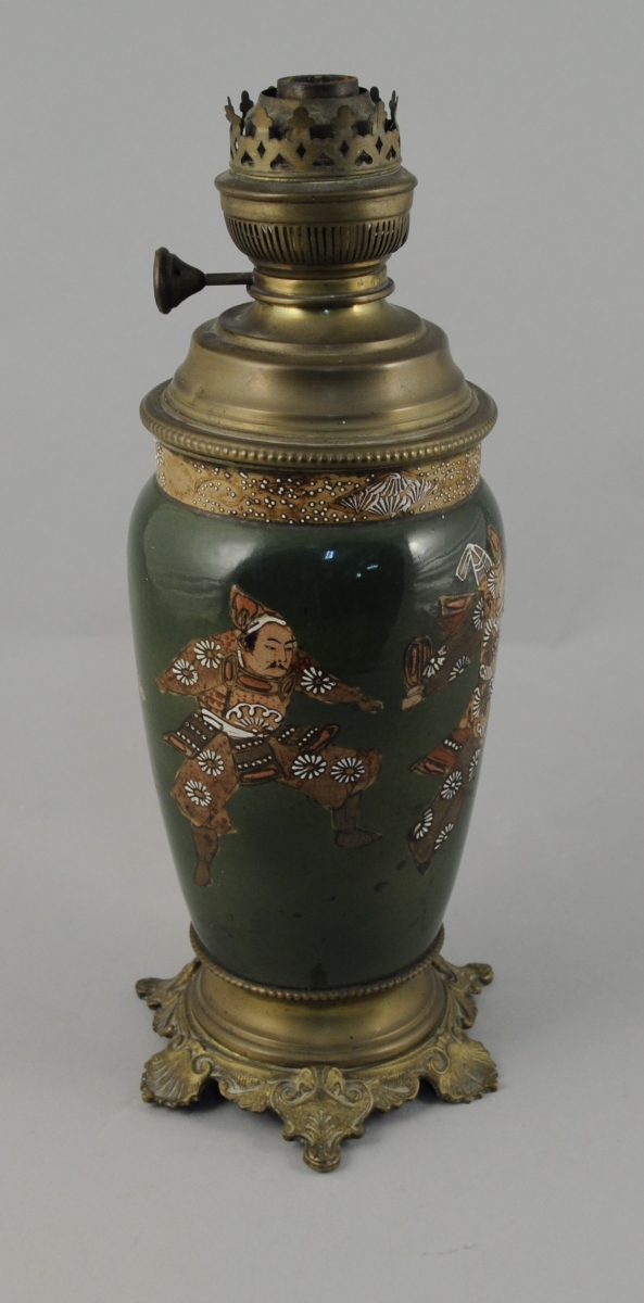 LAMPE A PETROLE Matador en porcelaine, à décor de quatre guerriers orientaux en tenue d'appârat sur fond vert foncé. Monture en laiton à décor de coquilles, lambrequins et frises de perles. Fin XIXème. Haut. 38 cm. (verre manquant)