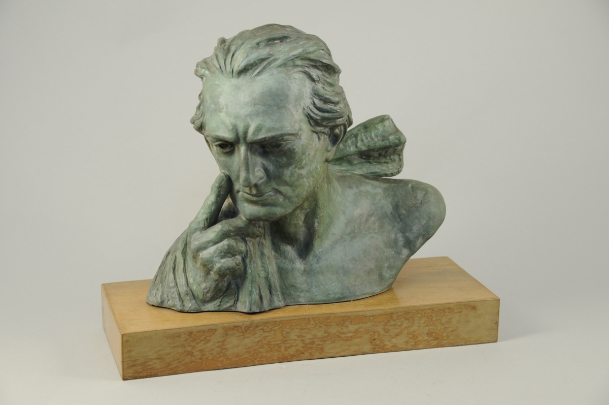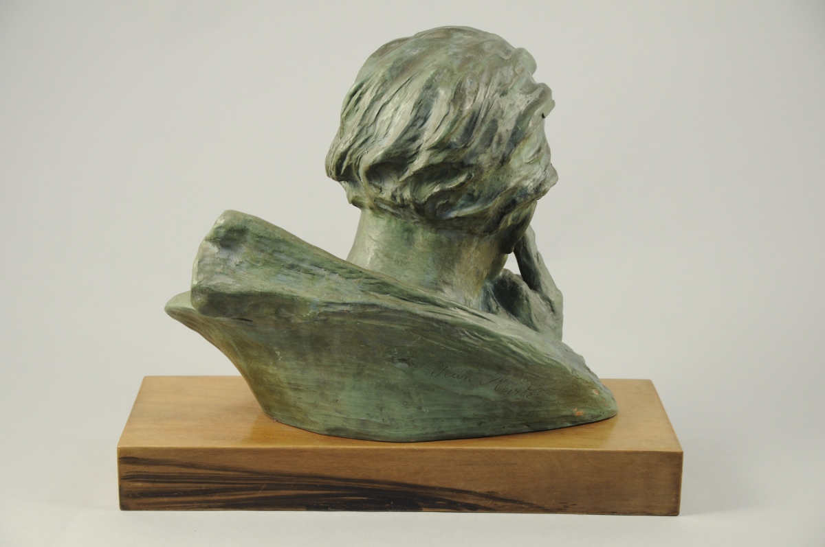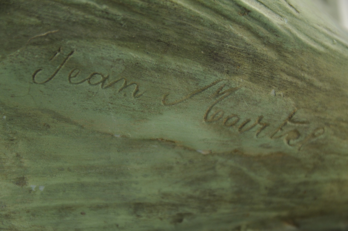 Jean MARTEL (1896-1966) d'après. Buste d'homme en terre cuite patinée vert de gris reposant sur un socle rectangulaire en bois clair. Porte la signature Jean Martel à l'arrière. Vers 1930-1940. Haut. 34, Larg. 40, Prof. 14,5 cm avec le socle.